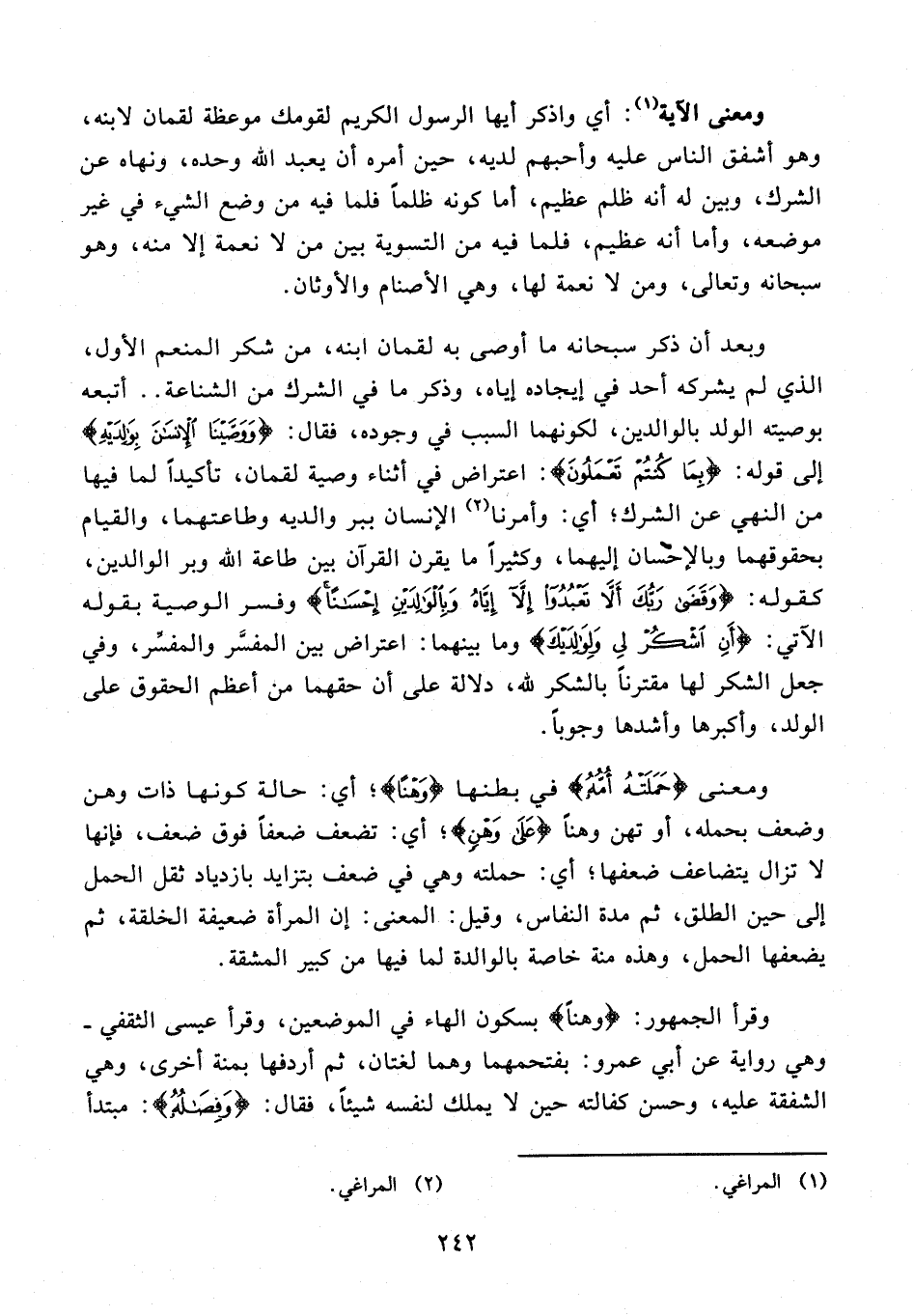 14 - وبعد أن ذكر سبحانه ما أوصى به لقمان ابنه، من شكر المنعم الأول، الذي لم يشركه أحد في إيجاده إياه، وذكر ما في الشرك من الشناعة .. أتبعه بوصيته الولد بالوالدين، لكونهما السبب في وجوده، فقال: {وَوَصَّيْنَا الْإِنْسَانَ بِوَالِدَيْهِ} إلى قوله: {بِمَا كُنْتُمْ تَعْمَلُونَ}: اعتراض في أثناء وصية لقمان، تأكيدًا لما فيها من النهي عن الشرك؛ أي: وأمرنا (¬2) الإنسان ببر والديه وطاعتهما، والقيام بحقوقهما وبالإحسان إليهما، وكثيرًا ما يقرن القرآن بين طاعة الله وبر الوالدين، كقوله: {وَقَضَى رَبُّكَ أَلَّا تَعْبُدُوا إِلَّا إِيَّاهُ وَبِالْوَالِدَيْنِ إِحْسَانًا} وفسر الوصية بقوله الآتي: {أَنِ اشْكُرْ لِي وَلِوَالِدَيْكَ} وما بينهما: اعتراض بين المفسَّر والمفسِّر، وفي جعل الشكر لها مقترنًا بالشكر لله، دلالة على أن حقهما من أعظم الحقوق على الولد، وأكبرها وأشدها وجوبًا.