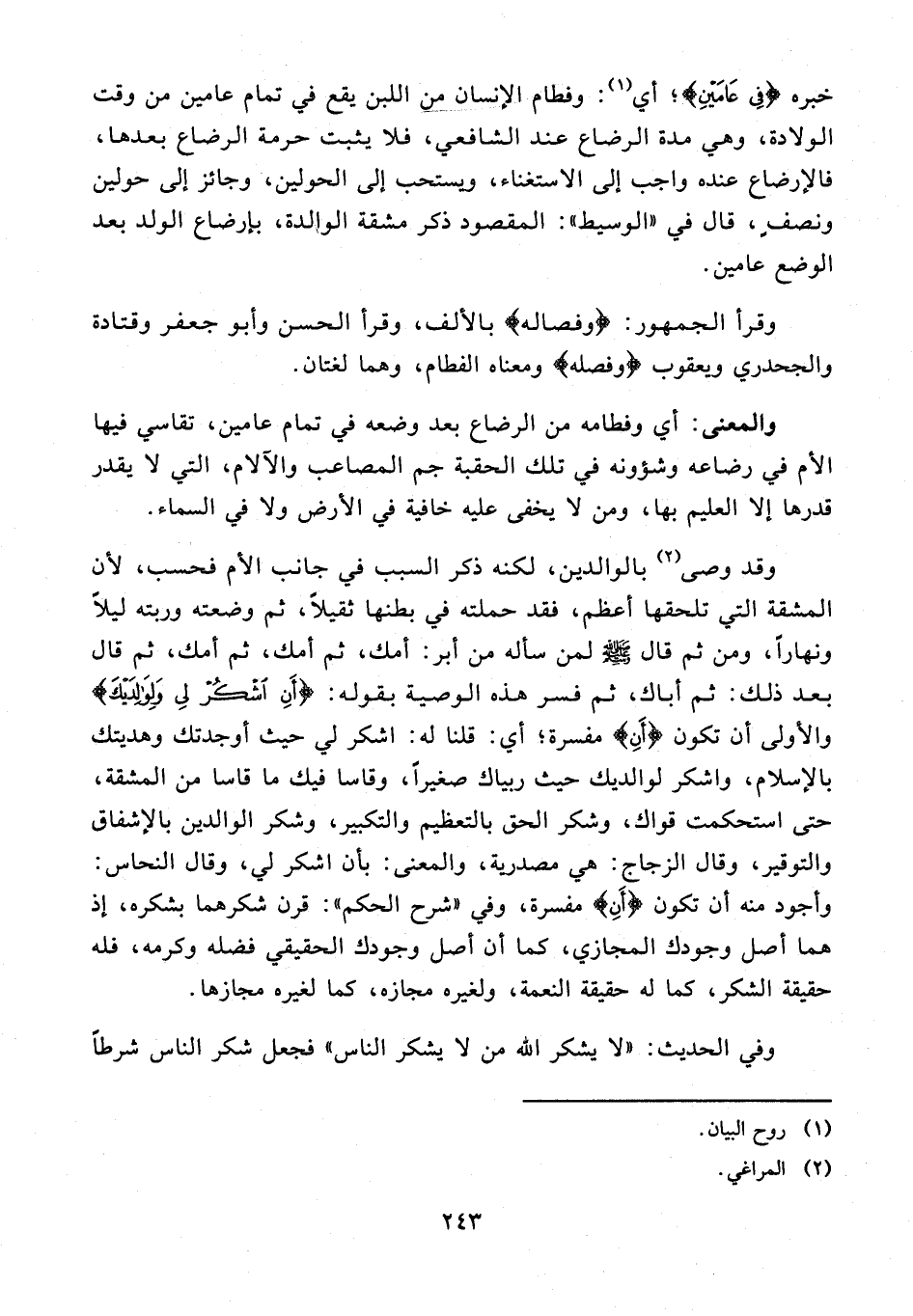والمعنى: أي وفطامه من الرضاع بعد وضعه في تمام عامين، تقاسي فيها الأم في رضاعه وشؤونه في تلك الحقبة جم المصاعب والآلام، التي لا يقدر قدرها إلا العليم بها، ومن لا يخفى عليه خافية في الأرض ولا في السماء.