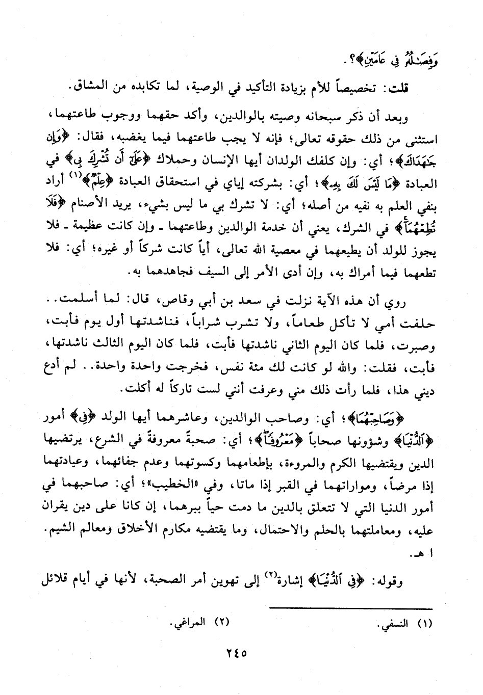 15 - وبعد أن ذكر سبحانه وصيته بالوالدين، وأكد حقهما ووجوب طاعتهما، استثنى من ذلك حقوقه تعالى؛ فإنه لا يجب طاعتهما فيما يغضبه، فقال: {وَإِنْ جَاهَدَاكَ}؛ أي: وإن كلفك الولدان أيها الإنسان وحملاك {عَلَى أَنْ تُشْرِكَ بِي} في العبادة {مَا لَيْسَ لَكَ بِهِ}؛ أي: بشركته إياي في استحقاق العبادة {عِلْمٌ} (¬1) أراد بنفي العلم به نفيه من أصله؛ أي: لا تشرك بي ما ليس بشيء، يريد الأصنام {فَلَا تُطِعْهُمَا} في الشرك، يعني أن خدمة الوالدين وطاعتهما - وإن كانت عظيمة - فلا يجوز للولد أن يطيعهما في معصية الله تعالى، أيًا كانت شركًا أو غيره؛ أي: فلا تطعهما فيما أمراك به، وإن أدى الأمر إلى السيف فجاهدهما به.