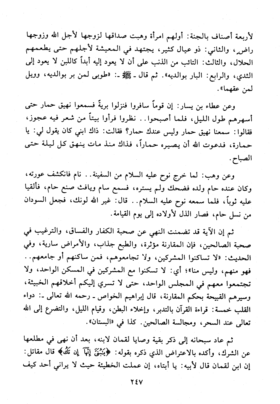 وعن عطاء بن يسار: إن قومًا سافروا فنزلوا بريةً فسمعوا نهيق حمار حتى أسهرهم طول الليل، فلما أصبحوا .. نظروا فرأوا بيتًا من شعر فيه عجوز، فقالوا: سمعنا نهيق حمار وليس عندك حمار؟ فقالت: ذاك ابني كان يقول لي: يا حمارة، فدعوت الله أن يصيره حمارًا، فذاك منذ مات ينهق كل ليلة حتى الصباح.