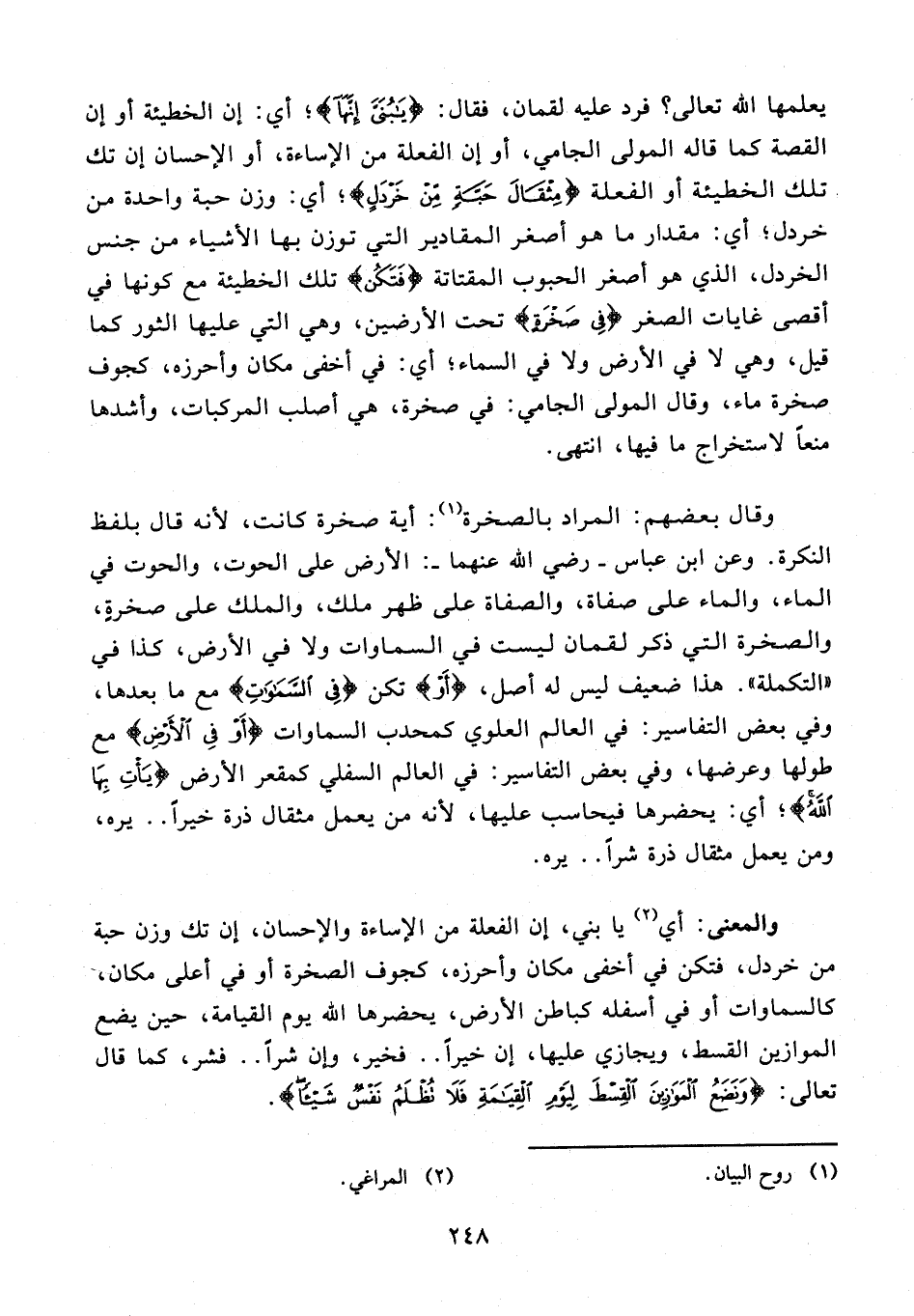 والمعنى: أي (¬2) يا بني، إن الفعلة من الإساءة والإحسان, إن تك وزن حبة من خردل، فتكن في أخفى مكان وأحرزه، كجوف الصخرة أو في أعلى مكان، كالسماوات أو في أسفله كباطن الأرض، يحضرها الله يوم القيامة، حين يضع الموازين القسط، ويجازي عليها، إن خيرًا .. فخير، وإن شرًا .. فشر، كما قال تعالى: {وَنَضَعُ الْمَوَازِينَ الْقِسْطَ لِيَوْمِ الْقِيَامَةِ فَلَا تُظْلَمُ نَفْسٌ شَيْئًا}.