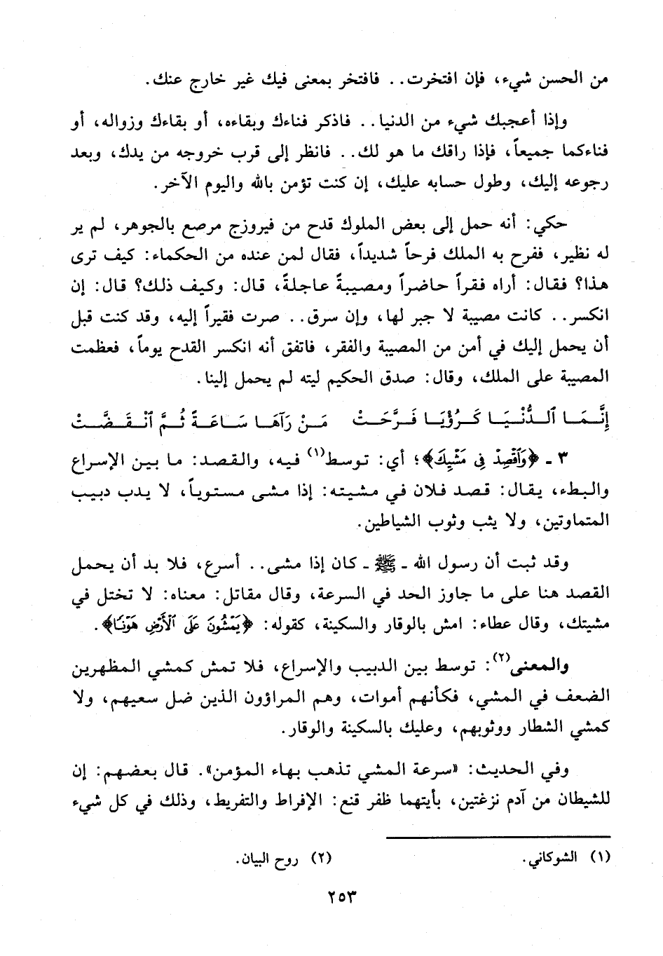 3 - 19 {وَاقْصِدْ فِي مَشْيِكَ}؛ أي: توسط (¬1) فيه، والقصد: ما بين الإسراع والبطء، يقال: قصد فلان في مشيته: إذا مشى مستويًا، لا يدب دبيب المتماوتين، ولا يثب وثوب الشياطين.