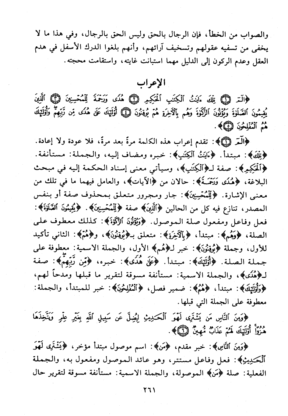{الم (1)}: تقدم إعراب هذه الكلمة مرةً بعد مرةً، فلا عودة ولا إعادة. {تِلْكَ}: مبتدأ. {آيَاتُ الْكِتَابِ}: خبره ومضاف إليه، والجملة: مستأنفة. {الْحَكِيمِ}: صفة لـ {الْكِتَابِ}، وسيأتي معنى إسناد الحكمة إليه في مبحث البلاغة، {هُدًى وَرَحْمَةً}: حالان من {الآيات}، والعامل فيهما ما في تلك من معنى الإشارة. {لِلْمُحْسِنِينَ}: جار ومجرور متعلق بمحذوف صفة أو بنفس المصدر، تنازع فيه كل من الحالين {الَّذِينَ} صفة {لِلْمُحْسِنِينَ}. {يُقِيمُونَ الصَّلَاةَ}: فعل وفاعل ومفعول صلة الموصول. {وَيُؤْتُونَ الزَّكَاةَ}: كذلك معطوف على الصلة، {وَهُمْ}: مبتدأ، {بِالْآخِرَةِ}: متعلق بـ {يُوقِنُونَ}، و {هُمْ}: الثاني تأكيد للأول، وجملة {يُوقِنُونَ}: خبر لـ {هُم} الأول، والجملة الاسمية: معطوفة على جملة الصلة. {أُولَئِكَ}: مبتدأ. {عَلَى هُدًى}: خبره، {مِنْ رَبِّهِمْ}: صفة لـ {هُدًى}، والجملة الاسمية: مستأنفة مسوقة لتقرير ما قبلها ومدحًا لهم، {وَأُولَئِكَ}: مبتدأ، {هُمُ}: ضمير فصل، {الْمُفْلِحُونَ}: خبر للمبتدأ، والجملة: معطوفة على الجملة التي قبلها.