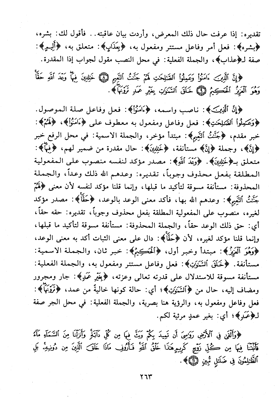 {إِنَّ الَّذِينَ}: ناصب واسمه، {آمَنُوا}: فعل وفاعل صلة الموصول. {وَعَمِلُوا الصَّالِحَاتِ}: فعل وفاعل ومفعول به معطوف على {آمَنُوا}، {لَهُمْ}: خبر مقدم، {جَنَّاتُ النَّعِيمِ}: مبتدأ مؤخر، والجملة الاسمية: في محل الرفع خبر {إِنَّ}، وجملة {إِنَّ} مستأنفة، {خَالِدِينَ} حال مقدرة من ضمير لهم، {فِيهَا}: متعلق بـ {خَالِدِينَ}. {وَعْدَ اللَّهِ}: مصدر مؤكد لنفسه منصوب على المفعولية المطلقة بفعل محذوف وجوبًا، تقديره: وعدهم الله ذلك وعدًا، والجملة المحذوفة: مستأنفة مسوقة لتأكيد ما قبلها، وإنما قلنا مؤكد لنفسه لأن معنى {لَهُمْ جَنَّاتُ النَّعِيمِ}: وعدهم الله بها، فأكد معنى الوعد بالوعد، {حَقًّا}: مصدر مؤكد لغيره، منصوب على المفعولية المطلقة بفعل محذوف وجوبًا، تقديره: حقه حقًا، أي: حق ذلك الوعد حقًا، والجملة المحذوفة: مستأنفة مسوقة لتأكيد ما قبلها، وإنما قلنا مؤكد لغيره؛ لأن {حَقًّا}: دال على معنى الثبات أكد به معنى الوعد، {وَهُوَ الْعَزِيزُ}: مبتدأ وخبر أول، {الْحَكِيمُ}: خبر ثان، والجملة الاسمية: مستأنفة. {خَلَقَ السَّمَاوَاتِ}: فعل وفاعل مستتر ومفعول به، والجملة الفعلية: مستأنفة مسوقة للاستدلال على قدرته تعالى وعزته، {بِغَيْرِ عَمَدٍ}: جار ومجرور ومضاف إليه، حال من {السَّمَاوَاتِ}؛ أي: حالة كونها خاليةً من عمد، {تَرَوْنَهَا}: فعل وفاعل ومفعول به، والرؤية هنا بصرية، والجملة الفعلية: في محل الجر صفة لـ {عَمَدٍ}؛ أي: بغير عمدٍ مرئية لكم.