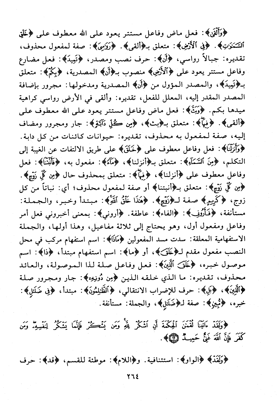 {وَأَلْقَى}: فعل ماض وفاعل مستتر يعود على الله معطوف على {خَلَقَ السَّمَاوَاتِ}. {فِي الْأَرْضِ}: متعلق بـ {ألقى}. {رَوَاسِيَ}: صفة لمفعول محذوف، تقديره: جبالًا، رواسي، {أَنْ}: حرف نصب ومصدر، {تَمِيدَ}: فعل مضارع وفاعل مستتر يعود على {الْأَرْضِ} منصوب بـ {أَنْ} المصدرية، {بِكُمْ}: متعلق بـ {تَمِيدَ}، والمصدر المؤول من {أَنْ} المصدرية ومدخولها: مجرور بإضافة المصدر المقدر إليه، المعلل للفعل، تقديره: وألقى في الأرض رواسي كراهية ميدها بكم. {وَبَثَّ}: فعل ماض وفاعل مستتر يعود على الله معطوف على {ألقى}. {فِيهَا}: متعلق بـ {بث}، {مِنْ كُلِّ دَابَّةٍ}: جار ومجرور ومضاف إليه، صفة لمفعول به محذوف، تقديره: حيوانات كائنات من كل دابة. {وَأَنْزَلْنَا}: فعل وفاعل معطوف على {خَلَقَ} على طريق الالتفات عن الغيبة إلى التكلم، {مِنَ السَّمَاءِ}: متعلق بـ {أنزلنا}، {مَاءً}: مفعول به، {فَأَنْبَتْنَا}: فعل وفاعل معطوف على {أنزلنا}، {فِيهَا}: متعلق بمحذوف حال {مِنْ كُلِّ زَوْجٍ}. {مِنْ كُلِّ زَوْجٍ}: متعلق بـ {أنبتنا} أو صفة لمفعول محذوف؛ أي: نباتًا من كل زوج، {كَرِيمٍ} صفة لـ {زَوْجٍ}. {هَذَا خَلْقُ اللَّهِ}: مبتدأ وخبر، والجملة: مستأنفة، {فَأَرُونِي}: {الفاء}: عاطفة. {أروني}: بمعنى أخبروني فعل أمر وفاعل ومفعول أول، وهو يحتاج إلى ثلاثة مفاعيل، وهذا أولها، والجملة الاستفهامية المعلقة: سدت مسد المفعولين {مَاذَا}: اسم استفهام مركب في محل النصب مفعول مقدم لـ {خَلَقَ}، أو {ما}: اسم استفهام مبتدأ، {ذا}: اسم موصول خبره، {خَلَقَ الَّذِينَ}: فعل وفاعل صلة لذا الموصولة، والعائد محذوف، تقديره: ما الذي خلقه الذين {مِنْ دُونِهِ}: جار ومجرور صلة {الَّذِينَ}، {بَلِ}: حرف للإضراب الانتقالي، {الظَّالِمُونَ}: مبتدأ، {فِي ضَلَالٍ}: خبره، {مُبِينٍ}: صفة لـ {ضَلَالٍ}، والجملة: مستأنفة.