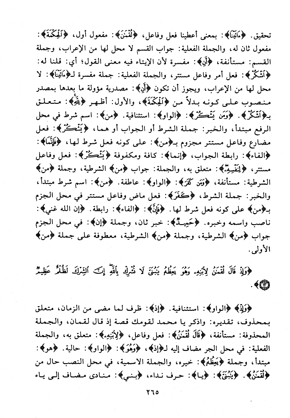 تحقيق. {آتَيْنَا}: بمعنى أعطينا فعل وفاعل، {لُقْمَانَ}: مفعول أول، {الْحِكْمَةَ}: مفعول ثان له، والجملة الفعلية: جواب القسم لا محل لها من الإعراب، وجملة القسم: مستأنفة، {أَنِ}: مفسرة لأن الإيتاء فيه معنى القول؛ أي: قلنا له: {اشْكُرْ}: فعل أمر وفاعل مستتر، والجملة الفعلية: جملة مفسرة لـ {آتَيْنَا}: لا محل لها من الإعراب، ويجوز أن تكون {أَنِ}: مصدرية مؤولة ما بعدها بمصدر منصوب على كونه بدلًا من {الْحِكْمَةَ}، والأول: أظهر {لِلَّهِ}: متعلق بـ {اشْكُرْ}. {وَمَنْ يَشْكُرْ}: {الواو}: استئنافية. {من}: اسم شرط في محل الرفع مبتدأ، والخبر: جملة الشرط أو الجواب أو هما، {يَشْكُرُ}: فعل مضارع وفاعل مستتر مجزوم بـ {من}: على كونه فعل شرط لها، {فَإِنَّمَا}: {الفاء}: رابطة الجواب، {إنما}: كافة ومكفوفة {يَشْكُرُ}؛ فعل وفاعل مستتر، {لِنَفْسِهِ}: متعلق به، والجملة: جواب {من} الشرطية، وجملة {من} الشرطية: مستأنفة، {وَمَنْ كَفَرَ}: {الواو}: عاطفة. {من}: اسم شرط مبتدأ، والخبر: جملة الشرط، {كَفَرَ}: فعل ماض وفاعل مستتر في محل الجزم بـ {من} على كونه فعل شرط لها. {فَإِنَّ}: {الفاء}: رابطة. {إن الله غني}: ناصب واسمه وخبره. {حَمِيدٌ}: خبر ثان، وجملة {إن}: في محل الجزم جواب {من} الشرطية، وجملة {من} الشرطية، معطوفة على جملة {من} الأولى.