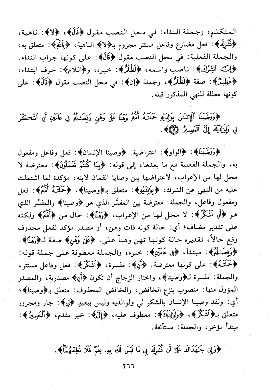 {وَوَصَّيْنَا}: {الواو}: اعتراضية. {وصينا الإنسان}: فعل وفاعل ومفعول به، والجملة الفعلية مع ما بعدها، إلى قوله: {بِمَا كُنْتُمْ تَعْمَلُونَ}: معترضة لا محل لها من الإعراب، لاعتراضها بين وصايا القمان لابنه، مؤكدة لما اشتملت عليه من النهي عن الشرك، {بِوَالِدَيْهِ}: متعلق بـ {وصينا}، {حَمَلَتْهُ أُمُّهُ}: فعل ومفعول وفاعل، والجملة: معترضة بين المفسَّر الذي هو {وصينا} والمفسِّر الذي هو {أَنِ اشْكُرْ}: لا محل لها من الإعراب، {وَهْنًا}: حال من {أُمُّهُ} ولكنه على تقدير مضاف؛ أي: حالة كونه ذات وهن، أو مصدر مؤكد لفعل محذوف وقع حالًا، تقديره حالة كونها تهن وهنًا على. {عَلَى وَهْنٍ} صفة لـ {وَهْنًا}. {وَفِصَالُهُ}: مبتدأ، {فِي عَامَيْنِ}: خبره، والجملة معطوفة على جملة قوله: {حَمَلَتْهُ}: على كونها معترضة. {أَنِ}: مفسرة، {اشْكُرْ}: فعل وفاعل مستتر، والجملة: مفسرة لـ {وصينا}، واختار الزجاج أن تكون {أَنِ} مصدرية، والمصدر المؤول منها: منصوب بنزع الخافض، والخافض المحذوف: متعلق بـ {وصينا}؛ أي: ولقد وصينا الإنسان بالشكر لي ولوالديه وليس ببعيدٍ {لِي}: جار ومجرور متعلق بـ {اشْكُرْ}، {وَلِوَالِدَيْكَ}: معطوف عليه، {إِلَيَّ}: خبر مقدم، {الْمَصِيرُ}: مبتدأ مؤخر، والجملة: مستأنفة.
