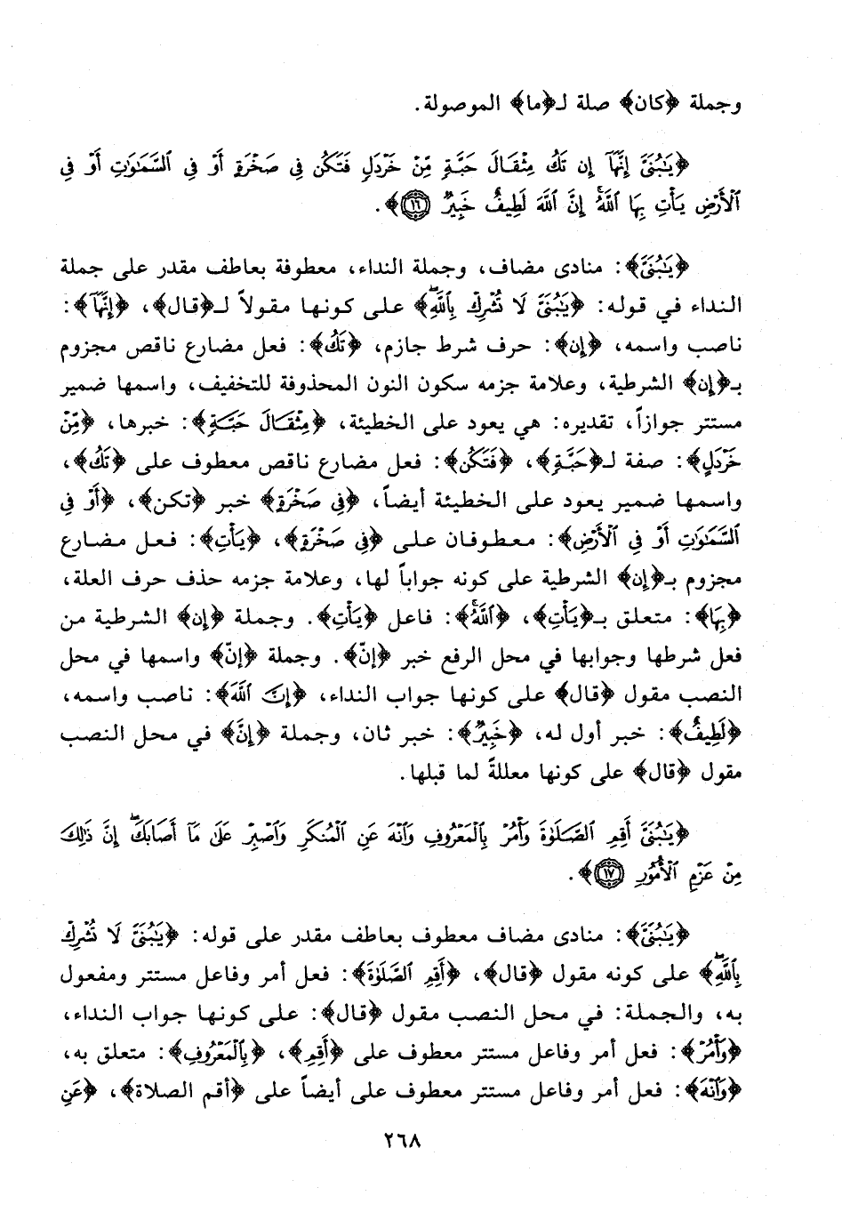 {يَا بُنَيَّ}: منادى مضاف، وجملة النداء، معطوفة بعاطف مقدر على جملة النداء في قوله: {يَا بُنَيَّ لَا تُشْرِكْ بِاللَّهِ} على كونها مقولًا لـ {قال}، {إِنَّهَا}: ناصب واسمه، {إن}: حرف شرط جازم، {تَكُ}: فعل مضارع ناقص مجزوم بـ {إن} الشرطية، وعلامة جزمه سكون النون المحذوفة للتخفيف، واسمها ضمير مستتر جوازًا، تقديره: هي يعود على الخطيئة، {مِثْقَالَ حَبَّةٍ}: خبرها، {مِنْ خَرْدَلٍ}: صفة لـ {حَبَّةٍ}، {فَتَكُنْ}: فعل مضارع ناقص معطوف على {تَكُ}، واسمها ضمير يعود على الخطيئة أيضًا، {فِي صَخْرَةٍ} خبر {تكن}، {أَوْ فِي السَّمَاوَاتِ أَوْ فِي الْأَرْضِ}: معطوفان على {فِي صَخْرَةٍ}، {يَأْتِ}: فعل مضارع مجزوم بـ {إِن} الشرطية على كونه جوابًا لها، وعلامة جزمه حذف حرف العلة، {بِهَا}: متعلق بـ {يَأْتِ}، {اللَّهُ}: فاعل {يَأْتِ}. وجملة {إن} الشرطية من فعل شرطها وجوابها في محل الرفع خبر {إنّ}. وجملة {إنّ} واسمها في محل النصب مقول {قال} على كونها جواب النداء، {إِنَّ اللَّهَ}: ناصب واسمه، {لَطِيفٌ}: خبر أول له، {خَبِيرٌ}: خبر ثان، وجملة {إِنَّ} في محل النصب مقول {قال} على كونها معللةً لما قبلها.