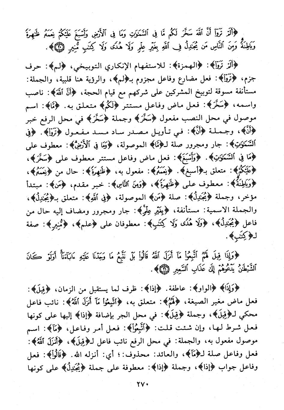 {أَلَمْ تَرَوْا}: {الهمزة}: للاستفهام الإنكاري التوبيخي، {لم}: حرف جزم، {تَرَوْا}: فعل مضارع وفاعل مجزوم بـ {لم}، والرؤية هنا قلبية، والجملة: مستأنفة مسوقة لتوبيخ المشركين على شركهم مع قيام الحجة، {أَنَّ اللَّهَ}: ناصب واسمه، {سَخَّرَ}: فعل ماض وفاعل مستتر {لَكُمْ} متعلق به. {مَا}: اسم موصول في محل النصب مفعول {سَخَّرَ} وجملة {سَخَّرَ} في محل الرفع خبر {أَنَّ}، وجملة {أَنَّ}: في تأويل مصدر ساد مسد مفعول {تَرَوْا}. {فِي السَّمَاوَاتِ}: جار ومجرور صلة لـ {مَّا} الموصولة، {وَمَا فِي الْأَرْضِ}: معطوف على {مَا فِي السَّمَاوَاتِ}. {وَأَسْبَغَ}: فعل ماض وفاعل مستتر معطوف على {سَخَّرَ}، {عَلَيْكُمْ}: متعلق بـ {أسبغ}. {نِعَمَهُ}: مفعول به، {ظَاهِرَةً}: حال من {نِعَمَهُ}، {وَبَاطِنَةً}: معطوف على {ظَاهِرَةً}، {وَمِنَ النَّاسِ}: خبر مقدم، {مَن}: مبتدأ مؤخر، وجملة {يُجَادِلُ}: صلة {مَن} الموصولة، {فِي اللَّهِ}: متعلق بـ {يُجَادِلُ}، والجملة الاسمية: مستأنفة، {بِغَيْرِ عِلْمٍ}: جار ومجرور ومضاف إليه حال من فاعل {يُجَادِلُ}، {وَلَا هُدًى وَلَا كِتَابٍ}: معطوفان على {علم}، {مُنِيرٍ}: صفة لـ {كِتَابٍ}.