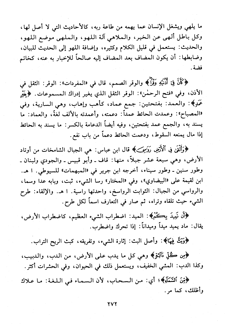 {كَأَنَّ فِي أُذُنَيْهِ وَقْرًا} والوقر الصمم، قال في "المفردات": الوقر: الثقل في الأذن، وفي "فتح الرحمن": الوقر الثقل الذي يغير إدراك المسموعات. {بِغَيْرِ عَمَدٍ}: والعمد: بفتحتين: جمع عماد، كأهب وإهاب، وهي السارية، وفي "المصباح": وعمدت الحائط عمدًا: دعمته، وأعمدته بالألف لغةً، والعماد: ما يسند به، والجمع عمد بفتحتين، وفيه أيضًا الدعامة بالكسر: ما يسند به الحائط إذا مال يمنعه السقوط، ودعمت الحائط دعمًا من باب نفع.