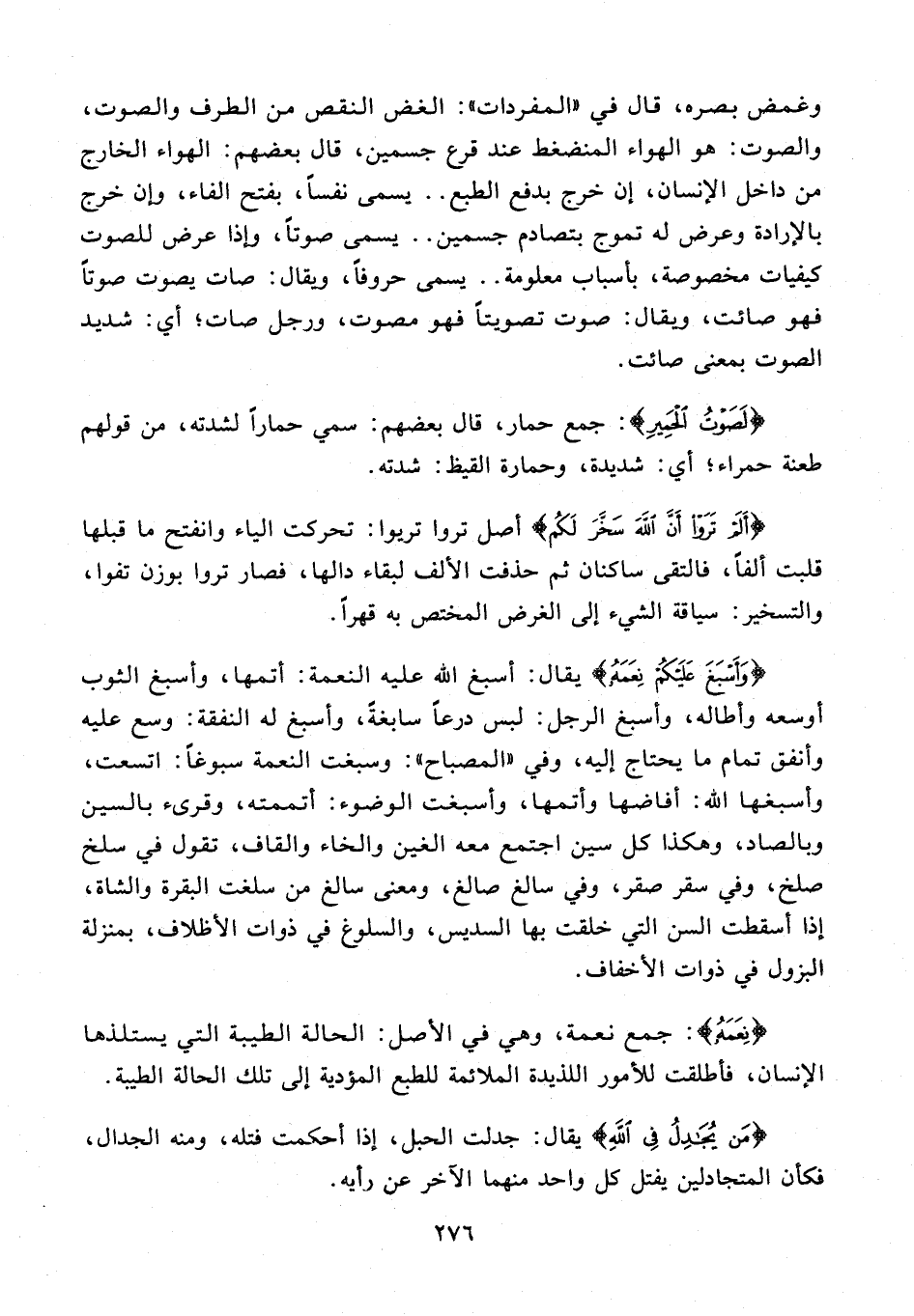 وغمض بصره، قال في "المفردات": الغض النقص من الطرف والصوت، والصوت: هو الواء المنضغط عند قرع جسمين، قال بعضهم: الهواء الخارج من داخل الإنسان، إن خرج بدفع الطبع .. يسمى نفسًا، بفتح الفاء، وإن خرج بالإرادة وعرض له تموج بتصادم جسمين .. يسمى صوتًا، وإذا عرض للصوت كيفيات مخصوصة، بأسباب معلومة .. يسمى حروفًا، ويقال: صات يصوت صوتًا فهو صائت، ويقال: صوت تصويتًا فهو مصوت، ورجل صات؛ أي: شديد الصوت بمعنى صائت.