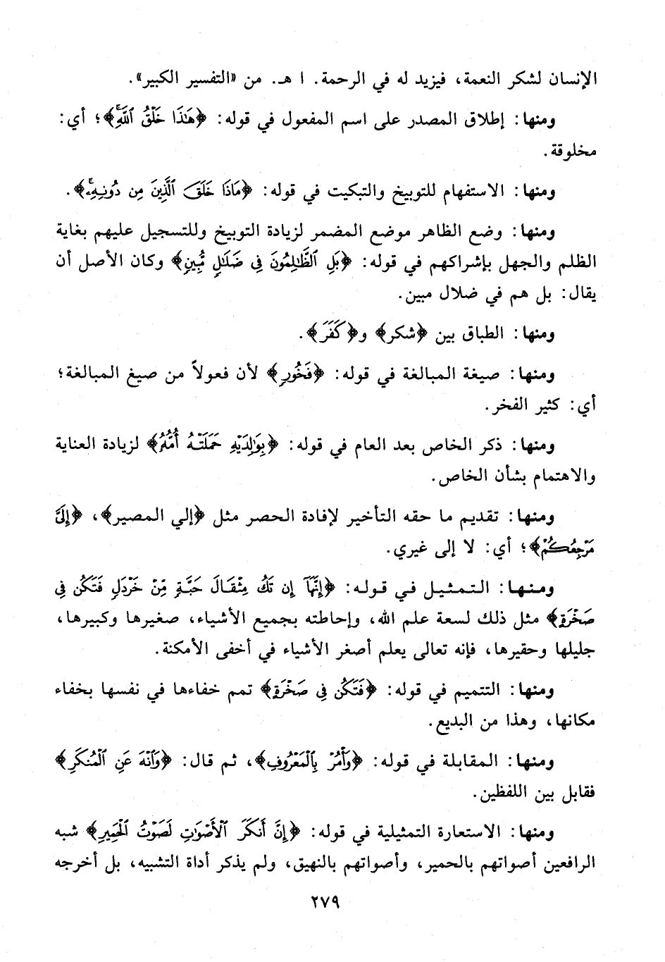 ومنها: التمثيل في قوله: {إِنَّهَا إِنْ تَكُ مِثْقَالَ حَبَّةٍ مِنْ خَرْدَلٍ فَتَكُنْ فِي صَخْرَةٍ} مثل ذلك لسعة علم الله، وإحاطته بجميع الأشياء، صغيرها وكبيرها، جليلها وحقيرها، فإنه تعالى يعلم أصغر الأشياء في أخفى الأمكنة.