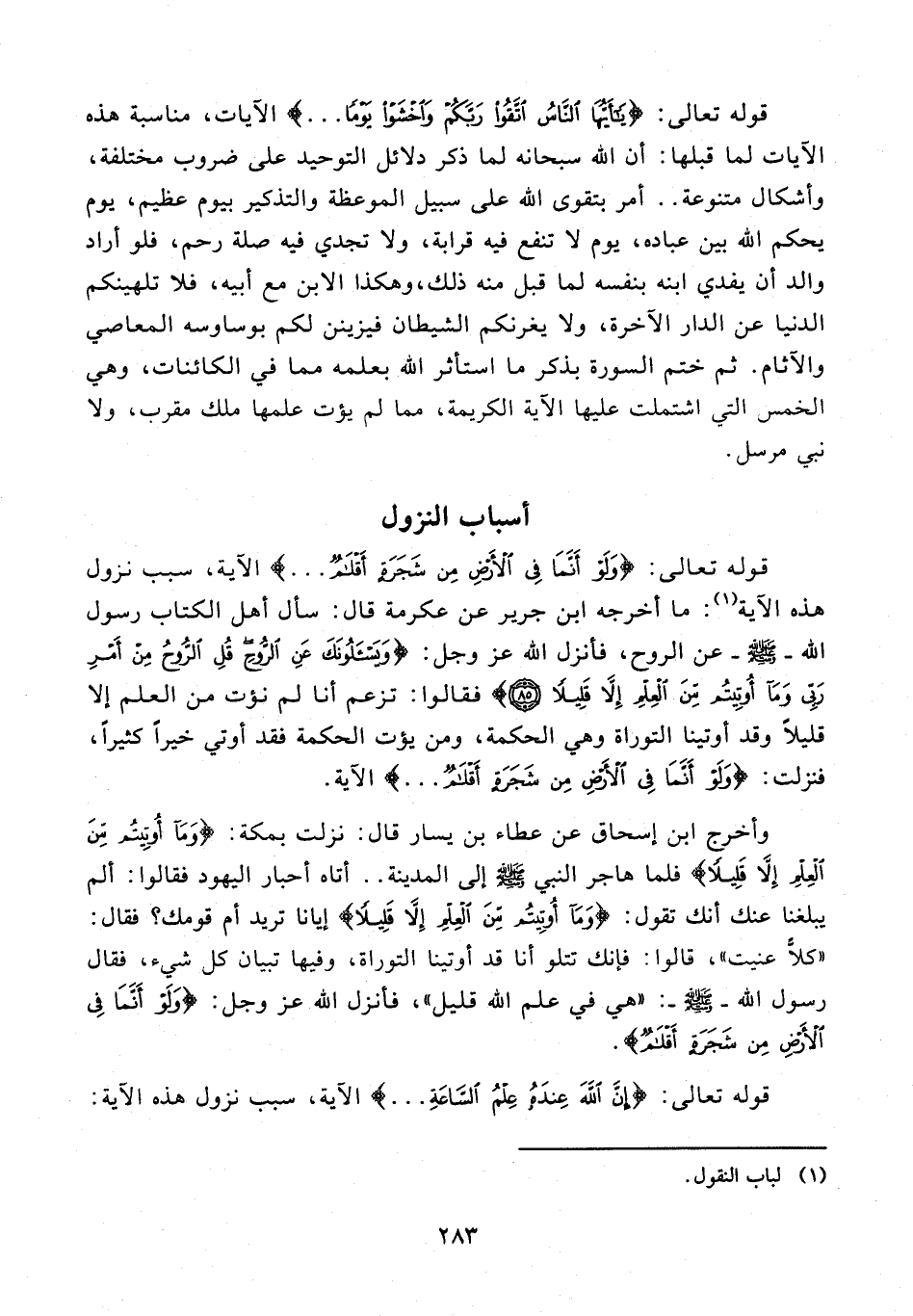 قوله تعالى: {وَلَوْ أَنَّمَا فِي الْأَرْضِ مِنْ شَجَرَةٍ أَقْلَامٌ ...} الآية، سبب نزول هذه الآية (¬1): ما أخرجه ابن جرير عن عكرمة قال: سأل أهل الكتاب رسول الله - صلى الله عليه وسلم - عن الروح، فأنزل الله عز وجل: {وَيَسْأَلُونَكَ عَنِ الرُّوحِ قُلِ الرُّوحُ مِنْ أَمْرِ رَبِّي وَمَا أُوتِيتُمْ مِنَ الْعِلْمِ إِلَّا قَلِيلًا (85)} فقالوا: تزعم أنا لم نؤت من العلم إلا قليلًا وقد أوتينا التوراة وهي الحكمة، ومن يؤت الحكمة فقد أوتي خيرًا كثيرًا، فنزلت: {وَلَوْ أَنَّمَا فِي الْأَرْضِ مِنْ شَجَرَةٍ أَقْلَامٌ ...} الآية.