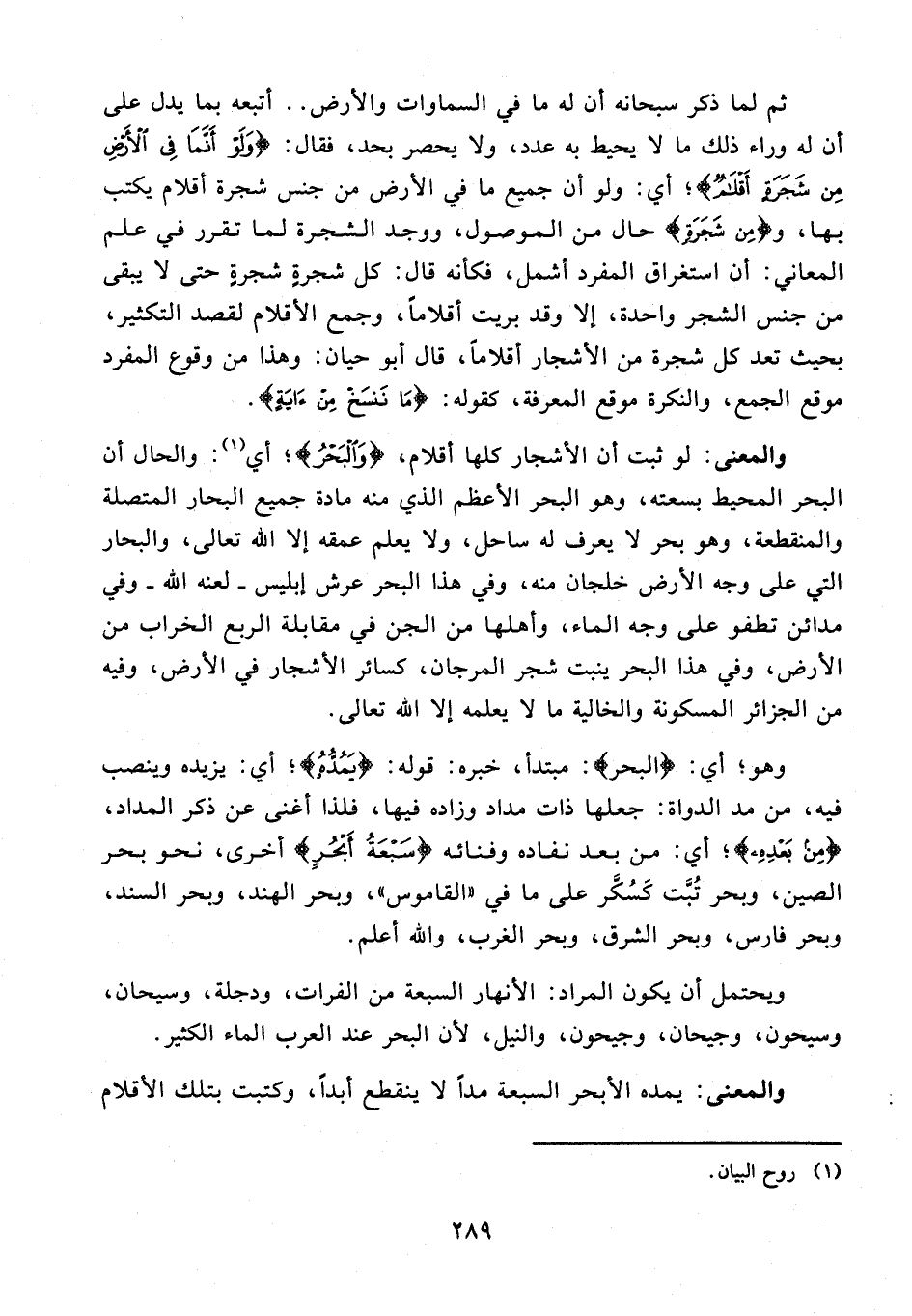 27 - ثم لما ذكر سبحانه أن له ما في السماوات والأرض .. أتبعه بما يدل على أن له وراء ذلك ما لا يحيط به عدد، ولا يحصر بحد، فقال: {وَلَوْ أَنَّمَا فِي الْأَرْضِ مِنْ شَجَرَةٍ أَقْلَامٌ}؛ أي: ولو أن جميع ما في الأرض من جنس شجرة أقلام يكتب بها، و {مِنْ شَجَرَةٍ} حال من الموصول، ووجد الشجرة لما تقرر في علم المعاني: أن استغراق المفرد أشمل، فكأنه قال: كل شجرةٍ شجرةٍ حتى لا يبقى من جنس الشجر واحدة، إلا وقد بريت أقلامًا، وجمع الأقلام لقصد التكثير، بحيث تعد كل شجرة من الأشجار أقلامًا، قال أبو حيان: وهذا من وقوع المفرد موقع الجمع، والنكرة موقع المعرفة، كقوله: {مَا نَنْسَخْ مِنْ آيَةٍ}.