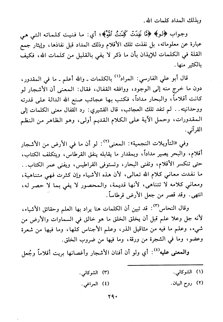 قال أبو علي الفارسي: المراد (¬1) بالكلمات - والله أعلم - ما في المقدور، دون ما خرج منه إلى الوجود، ووافقه القفال، فقال: المعنى أن الأشجار لو كانت أقلامًا، والبحار مدادًا، فكتب بها عجائب صنع الله الدالة على قدرته ووحدانيته .. لم تنفد تلك العجائب، قال القشيري: رد القفال معنى الكلمات إلى المقدورات، وحمل الآية على الكلام القديم أولى، وهو الظاهر من النظم القرآني.