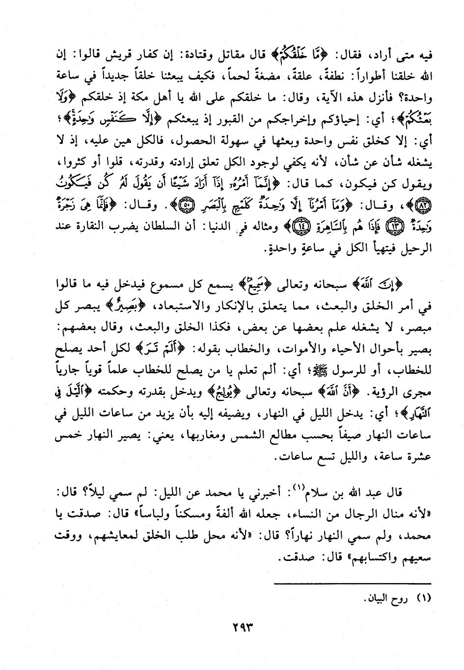 قال عبد الله بن سلام (¬1): أخبرني يا محمد عن الليل: لم سمي ليلًا؟ قال: لأنه منال الرجال من النساء، جعله الله ألفةً ومسكنًا ولباسًا" قال: صدقت يا محمد، ولم سمي النهار نهارًا؟ قال: "لأنه محل طلب الخلق لمعايشهم، ووقت سعيهم واكتسابهم" قال: صدقت.