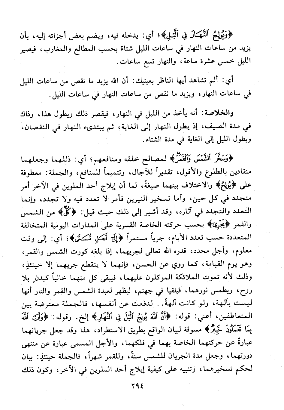 والخلاصة: أنه يأخذ من الليل في النهار، فيقصر ذلك ويطول هذا، وذاك في مدة الصيف، إذ يطول النهار إلى الغاية، ثم يبتدىء النهار في النقصان، ويطول الليل إلى الغاية في مدة الشتاء.