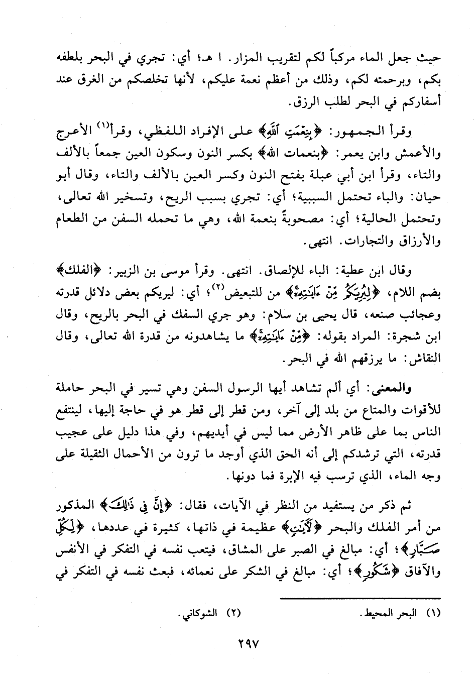 وقال ابن عطية: الباء للإلصاق. انتهى. وقرأ موسى بن الزبير: {الفلك} بضم اللام، {لِيُرِيَكُمْ مِنْ آيَاتِهِ} من للتبعيض (¬2)؛ أي: ليريكم بعض دلائل قدرته وعجائب صنعه، قال يحيى بن سلام: وهو جري السفك في البحر بالريح، وقال ابن شجرة: المراد بقوله: {مِنْ آيَاتِهِ} ما يشاهدونه من قدرة الله تعالى، وقال النقاش: ما يرزقهم الله في البحر.