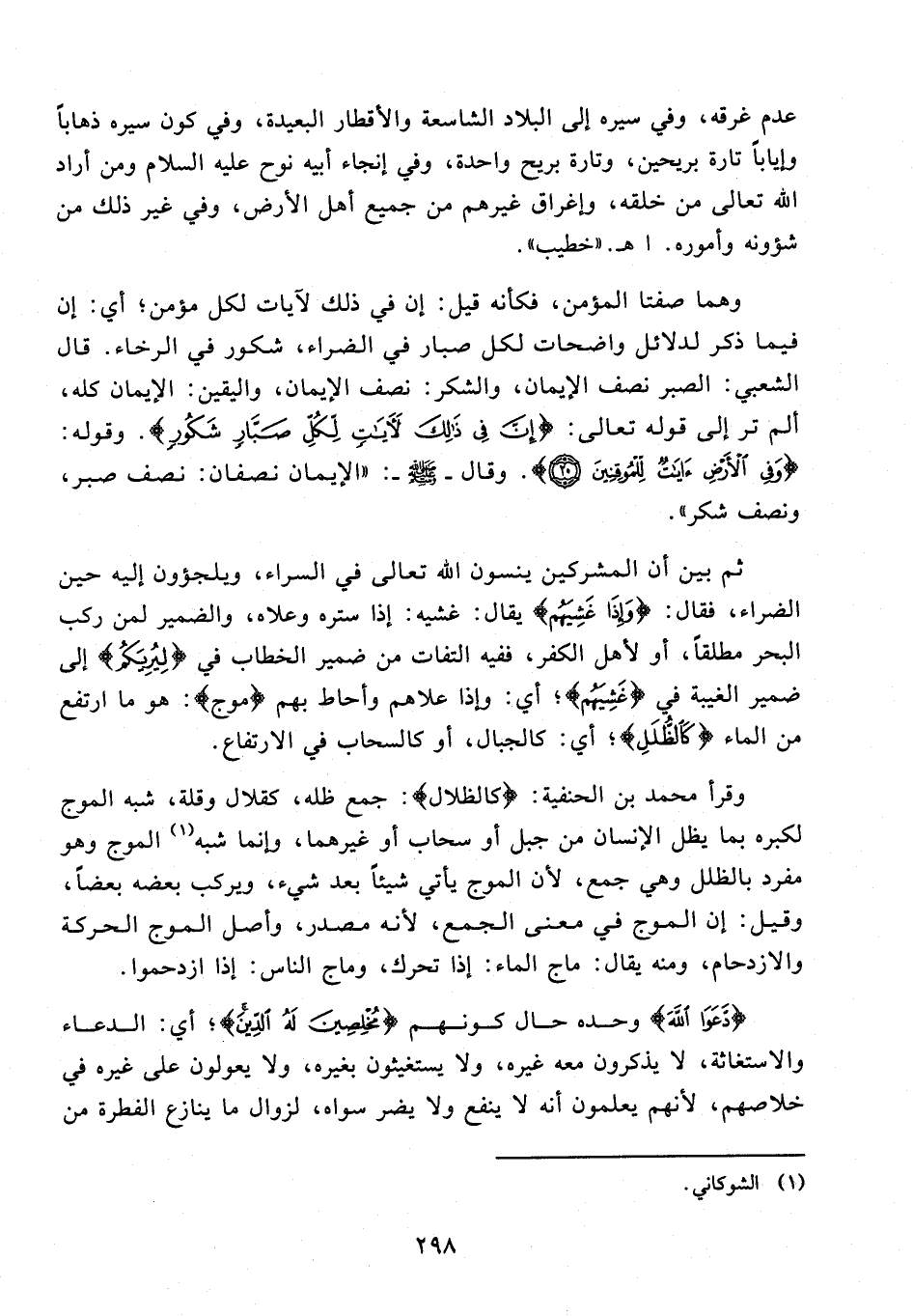 32 - ثم بين أن المشركين ينسون الله تعالى في السراء، ويلجؤون إليه حين الضراء، فقال: {وَإِذَا غَشِيَهُمْ} يقال: غشيه: إذا ستره وعلاه، والضمير لمن ركب البحر مطلقًا، أو لأهل الكفر، ففيه التفات من ضمير الخطاب في {لِيُرِيَكُمْ} إلى ضمير الغيبة في {غَشِيَهُمْ}؛ أي: وإذا علاهم وأحاط بهم {موج}: هو ما ارتفع من الماء {كَالظُّلَلِ}؛ أي: كالجبال، أو كالسحاب في الارتفاع.