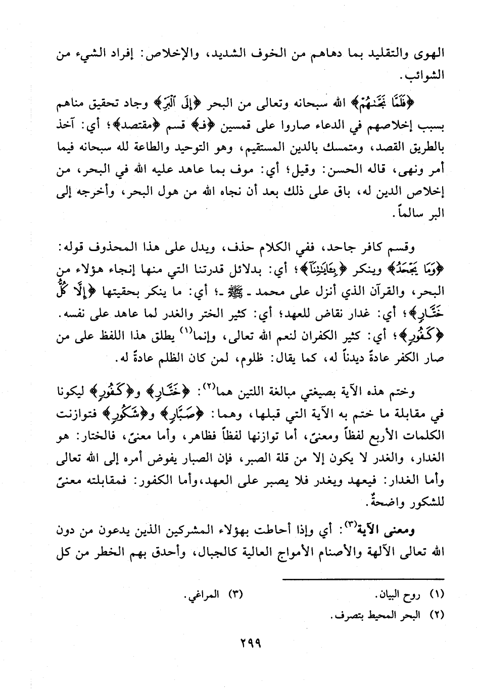الهوى والتقليد بما دهاهم من الخوف الشديد، والإخلاص: إفراد الشيء من الشوائب. {فَلَمَّا نَجَّاهُمْ} الله سبحانه وتعالى من البحر {إِلَى الْبَرِّ} وجاد تحقيق مناهم بسبب إخلاصهم في الدعاء صاروا على قمسين {فـ} قسم {مقتصد}؛ أي: آخذ بالطريق القصد، ومتمسك بالدين المستقيم، وهو التوحيد والطاعة لله سبحانه فيما أمر ونهى، قاله الحسن: وقيل؛ أي: موف بما عاهد عليه الله في البحر، من إخلاص الدين له، باق على ذلك بعد أن نجاه الله من هول البحر، وأخرجه إلى البر سالمًا.