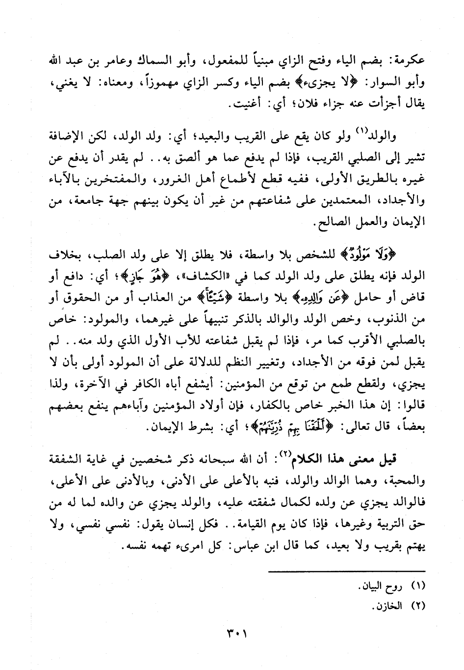 والولد (¬1) ولو كان يقع على القريب والبعيد؛ أي: ولد الولد، لكن الإضافة تشير إلى الصلبي القريب، فإذا لم يدفع عما هو ألصق به .. لم يقدر أن يدفع عن غيره بالطريق الأولى، ففيه قطع لأطماع أهل الغرور، والمفتخرين بالآباء والأجداد، المعتمدين على شفاعتهم من غير أن يكون بينهم جهة جامعة، من الإيمان والعمل الصالح.