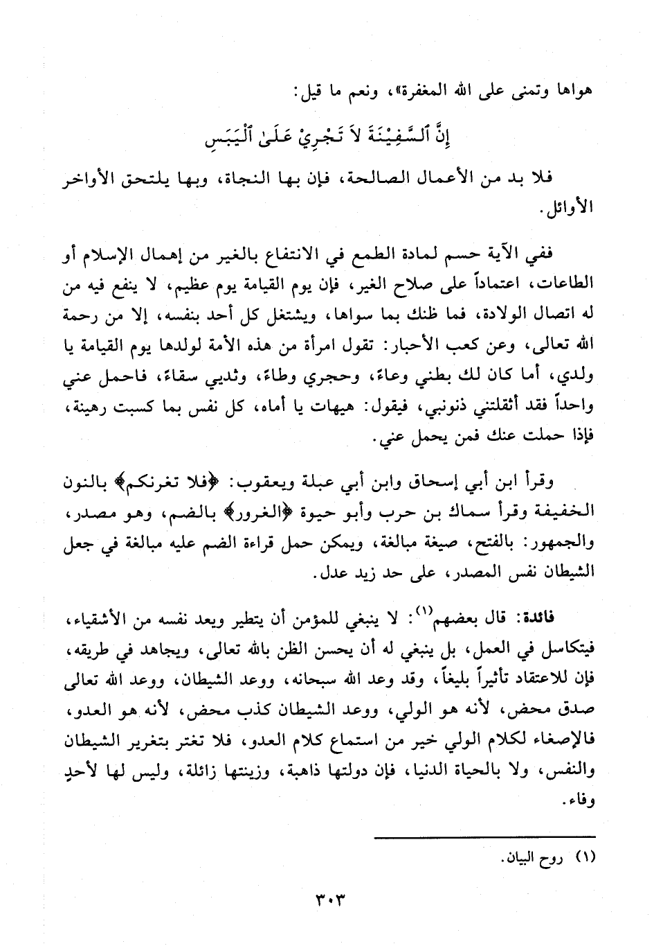 وقرأ ابن أبي إسحاق وابن أبي عبلة ويعقوب: {فلا تغرنكم} بالنون الخفيفة وقرأ سماك بن حرب وأبو حيوة {الغرور} بالضم، وهو مصدر، والجمهور: بالفتح، صيغة مبالغة، ويمكن حمل قراءة الضم عليه مبالغة في جعل الشيطان نفس المصدر، على حد زيد عدل.