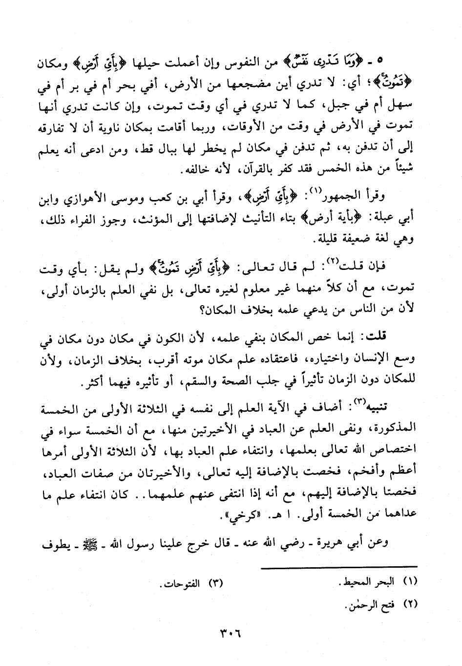 تنبيه (¬3): أضاف في الآية العلم إلى نفسه في الثلاثة الأولى من الخمسة المذكورة، ونفى العلم عن العباد في الأخيرتين منها، مع أن الخمسة سواء في اختصاص الله تعالى بعلمها، وانتفاء علم العباد بها, لأن الثلاثة الأولى أمرها أعظم وأفخم، فخصت بالإضافة إليه تعالى، والأخيرتان من صفات العباد، فخصتا بالإضافة إليهم، مع أنه إذا انتفى عنهم علمهما .. كان انتفاء علم ما عداهما من الخمسة أولى. اهـ. "كرخي".
