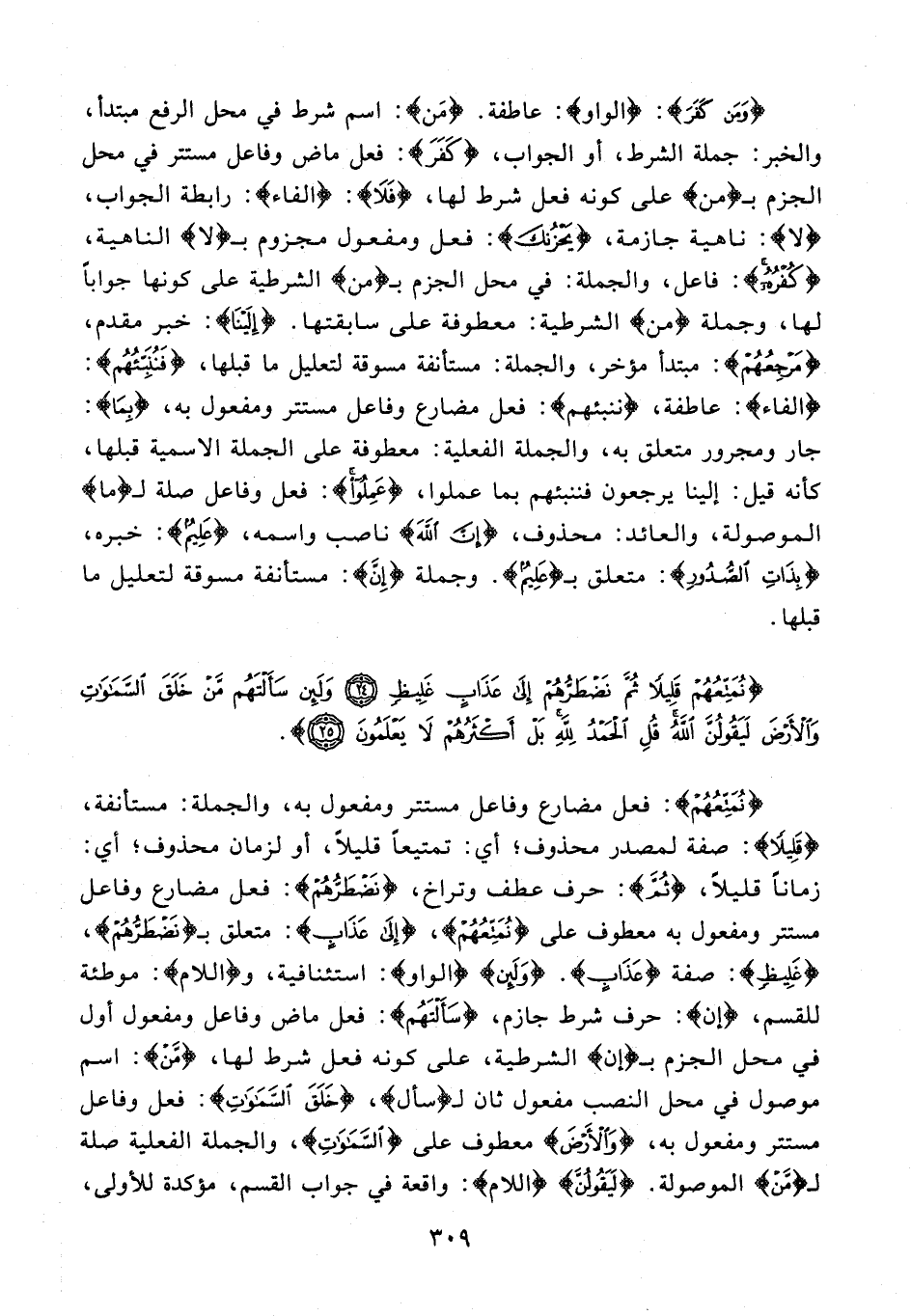 {نُمَتِّعُهُمْ}: فعل مضارع وفاعل مستتر ومفعول به، والجملة: مستأنفة، {قَلِيلًا}: صفة لمصدر محذوف؛ أي: تمتيعًا قليلًا، أو لزمان محذوف؛ أي: زمانًا قليلًا، {ثُمَّ}: حرف عطف وتراخ، {نَضْطَرُّهُمْ}: فعل مضارع وفاعل مستتر ومفعول به معطوف على {نُمَتِّعُهُمْ}، {إِلَى عَذَابٍ}: متعلق بـ {نَضْطَرُّهُمْ}، {غَلِيظٍ}: صفة {عَذَابٍ}. {وَلَئِنْ} {الواو}: استئنافية، و {اللام}: موطئة للقسم، {إن}: حرف شرط جازم، {سَأَلْتَهُمْ}: فعل ماض وفاعل ومفعول أول في محل الجزم بـ {إن} الشرطية، على كونه فعل شرط لها، {مَّنْ}: اسم موصول في محل النصب مفعول ثان لـ {سأل}، {خَلَقَ السَّمَاوَاتِ}: فعل وفاعل مستتر ومفعول به، {وَالْأَرْضَ} معطوف على {السَّمَاوَاتِ}، والجملة الفعلية صلة لـ {مَّنْ} الموصولة. {لَيَقُولُنَّ} {اللام}: واقعة في جواب القسم، مؤكدة للأولى،