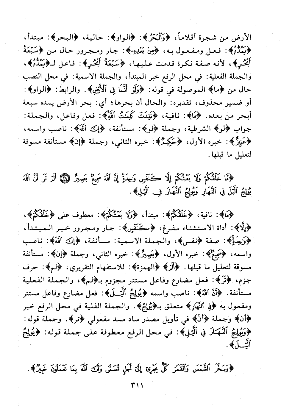 {مَا}: نافية، {خَلْقُكُمْ}: مبتدأ، {وَلَا بَعْثُكُمْ}: معطوف على {خَلْقُكُمْ}، {إِلَّا}: أداة الاستثناء مفرغ، {كَنَفْسٍ}: جار ومجرور خبر المبتدأ، {وَاحِدَةٍ}: صفة {نفس}، والجملة الاسمية: مستأنفة، {إِنَّ اللَّهَ}: ناصب واسمه، {سَمِيعٌ}: خبره الأول، {بَصِيرٌ}: خبره الثاني، وجملة {إن}: مستأنفة مسوقة لتعليل ما قبلها. {أَلَمْ} {الهمزة}: للاستفهام التقريري، {لم}: حرف جزم، {تَرَ}: فعل مضارع وفاعل مستتر مجزوم بـ {لم}، والجملة الفعلية مستأنفة. {أَنَّ اللَّهَ}: ناصب واسمه {يُولِجُ اللَّيْلَ}: فعل مضارع وفاعل مستتر ومفعول به {فِي النَّهَارِ} متعلق بـ {يُولِجُ}. والجملة الفعلية في محل الرفع خبر {أن} وجملة {أن} في تأويل مصدر ساد مسد مفعولي {تر}. وجملة قوله: {وَيُولِجُ النَّهَارَ فِي اللَّيْلِ}: في محل الرفع معطوفة على جملة قوله: {يُولِجُ اللَّيْلَ}.
