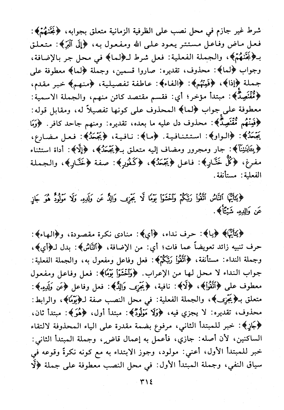 {يَا أَيُّهَا} {يا}: حرف نداء، {أي}: منادى نكرة مقصودة، و {الهاء}: حرف تنبيه زائد تعويضًا عما فات؛ أي: من الإضافة، {النَّاسُ}: بدل لـ {أي}، وجملة النداء: مستأنفة، {اتَّقُوا رَبَّكُمْ}: فعل وفاعل ومفعول به، والجملة الفعلية: جواب النداء لا محل لها من الإعراب. {وَاخْشَوْا يَوْمًا}: فعل وفاعل ومفعول معطوف على {اتَّقُوا}، {لَا}: نافية، {يَجْزِي وَالِدٌ}: فعل وفاعل {عَنْ وَلَدِهِ}: متعلق بـ {يَجْزِي}، والجملة الفعلية: في محل النصب صفة لـ {يَوْمًا}، والرابط: محذوف، تقديره: لا يجزي فيه، {وَلَا مَوْلُودٌ}: مبتدأ أول، {هُوَ}: مبتدأ ثان، {جَازٍ}: خبر للمبتدأ الثاني، مرفوع بضمة مقدرة على الياء المحذوفة لالتقاء الساكنين؛ لأن أصله: جازي، فأعمل به إعمال قاضٍ، وجملة المبتدأ الثاني: خبر للمبتدأ الأول، أعني: مولود، وجوز الابتداء به مع كونه نكرةً وقوعه في سياق النفي، وجملة المبتدأ الأول: في محل النصب معطوفة على جملة {لَا