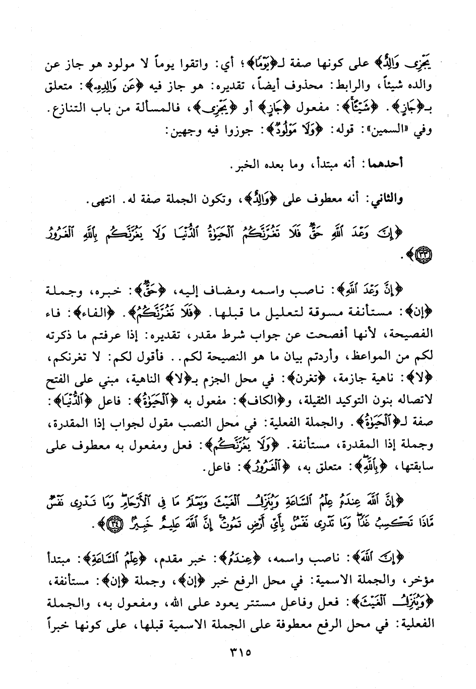 {إِنَّ وَعْدَ اللَّهِ}: ناصب واسمه ومضاف إليه، {حَقٌّ}: خبره، وجملة {إن}: مستأنفة مسوقة لتعليل ما قبلها. {فَلَا تَغُرَّنَّكُمُ}. {الفاء}: فاء الفصيحة؛ لأنها أفصحت عن جواب شرط مقدر، تقديره: إذا عرفتم ما ذكرته لكم من المواعظ، وأردتم بيان ما هو النصيحة لكم .. فأقول لكم: لا تغرنكم، {لا}: ناهية جازمة، {تغرن}: في محل الجزم بـ {لا} الناهية، مبني على الفتح لاتصاله بنون التوكيد الثقيلة، و {الكاف}: مفعول به {الْحَيَاةُ}: فاعل {الدُّنْيَا}: صفة لـ {الْحَيَاةُ}. والجملة الفعلية: في فحل النصب مقول لجواب إذا المقدرة، وجملة إذا المقدرة، مستأنفة. {وَلَا يَغُرَّنَّكُمْ}: فعل ومفعول به معطوف على سابقتها، {بِاللَّهِ}: متعلق به، {الْغَرُورُ}: فاعل.