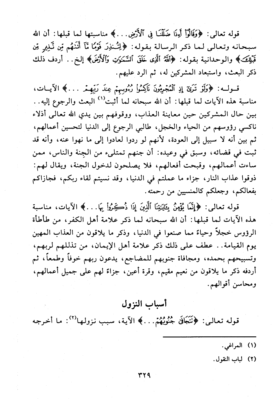 قوله تعالى: {إِنَّمَا يُؤْمِنُ بِآيَاتِنَا الَّذِينَ إِذَا ذُكِّرُوا بِهَا ...} الآيات، مناسبة هذه الآيات لما قبلها: أن الله سبحانه لما ذكر علامة أهل الكفر، من طأطأة الرؤوس خجلًا وحياءً مما صنعوا في الدنيا، وذكر ما يلاقون من العذاب المهين يوم القيامة .. عطف على ذلك ذكر علامة أهل الإيمان, من تذللهم لربهم، وتسبيحهم بحمده، ومجافاة جنوبهم للمضاجع، يدعون ربهم خوفًا وطمعًا، ثم أردفه ذكر ما يلاقون من نعيم مقيم، وقرة أعين، جزاءً لهم على جميل أعمالهم، ومحاسن أقوالهم.
