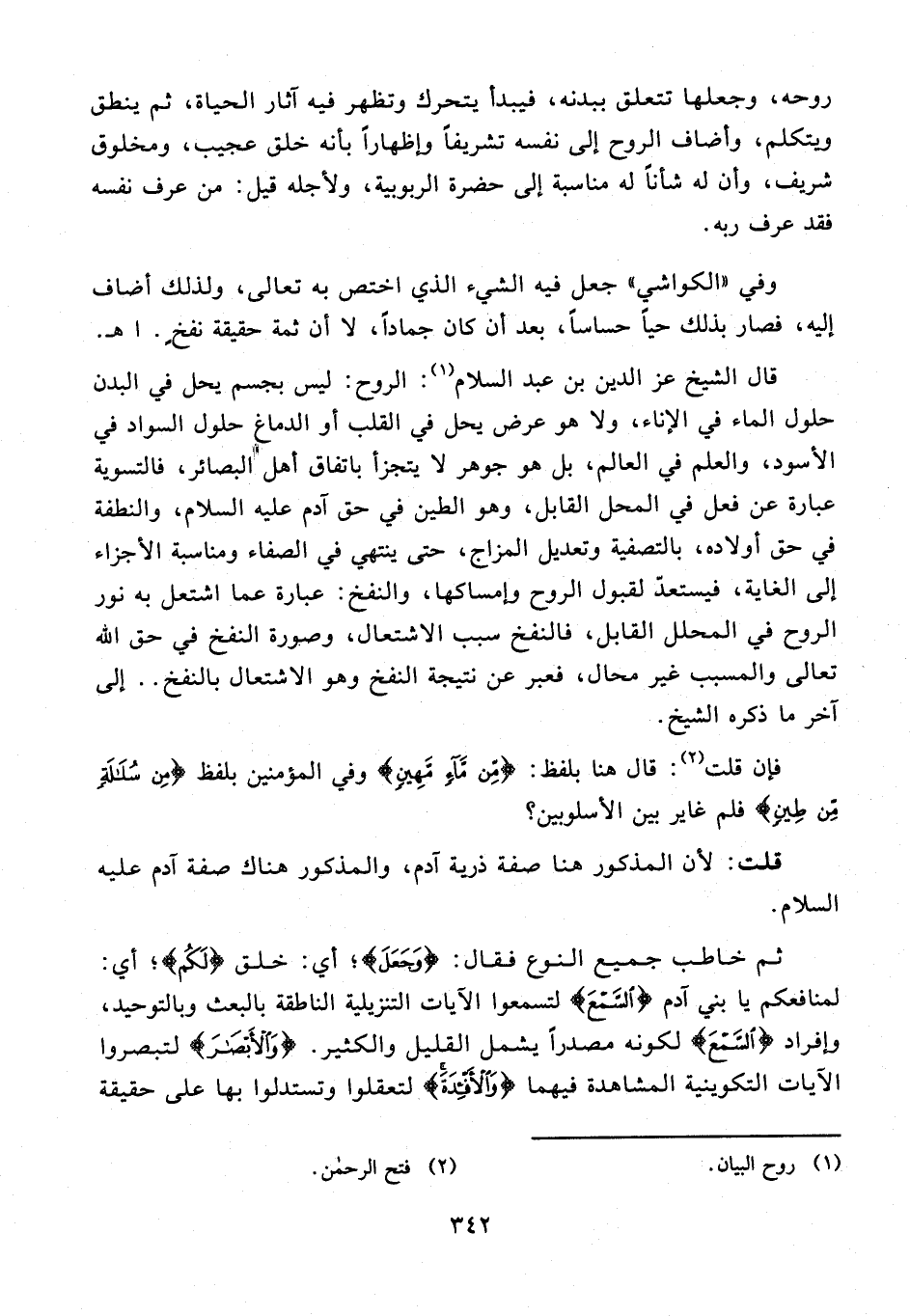 قال الشيخ عز الدين بن عبد السلام (¬1): الروح: ليس بجسم يحل في البدن حلول الماء في الإناء، ولا هو عرض يحل في القلب أو الدماغ حلول السواد في الأسود، والعلم في العالم، بل هو جوهر لا يتجزأ باتفاق أهل البصائر، فالتسوية عبارة عن فعل في المحل القابل، وهو الطين في حق آدم عليه السلام، والنطفة في حق أولاده، بالتصفية وتعديل المزاج، حتى ينتهي في الصفاء ومناسبة الأجزاء إلى الغاية، فيستعدّ لقبول الروح وإمساكها، والنفخ: عبارة عما اشتعل به نور الروح في المحلل القابل، فالنفخ سبب الاشتعال، وصورة النفخ في حق الله تعالى والمسبب غير محال، فعبر عن نتيجة النفخ وهو الاشتعال بالنفخ .. إلى آخر ما ذكره الشيخ.