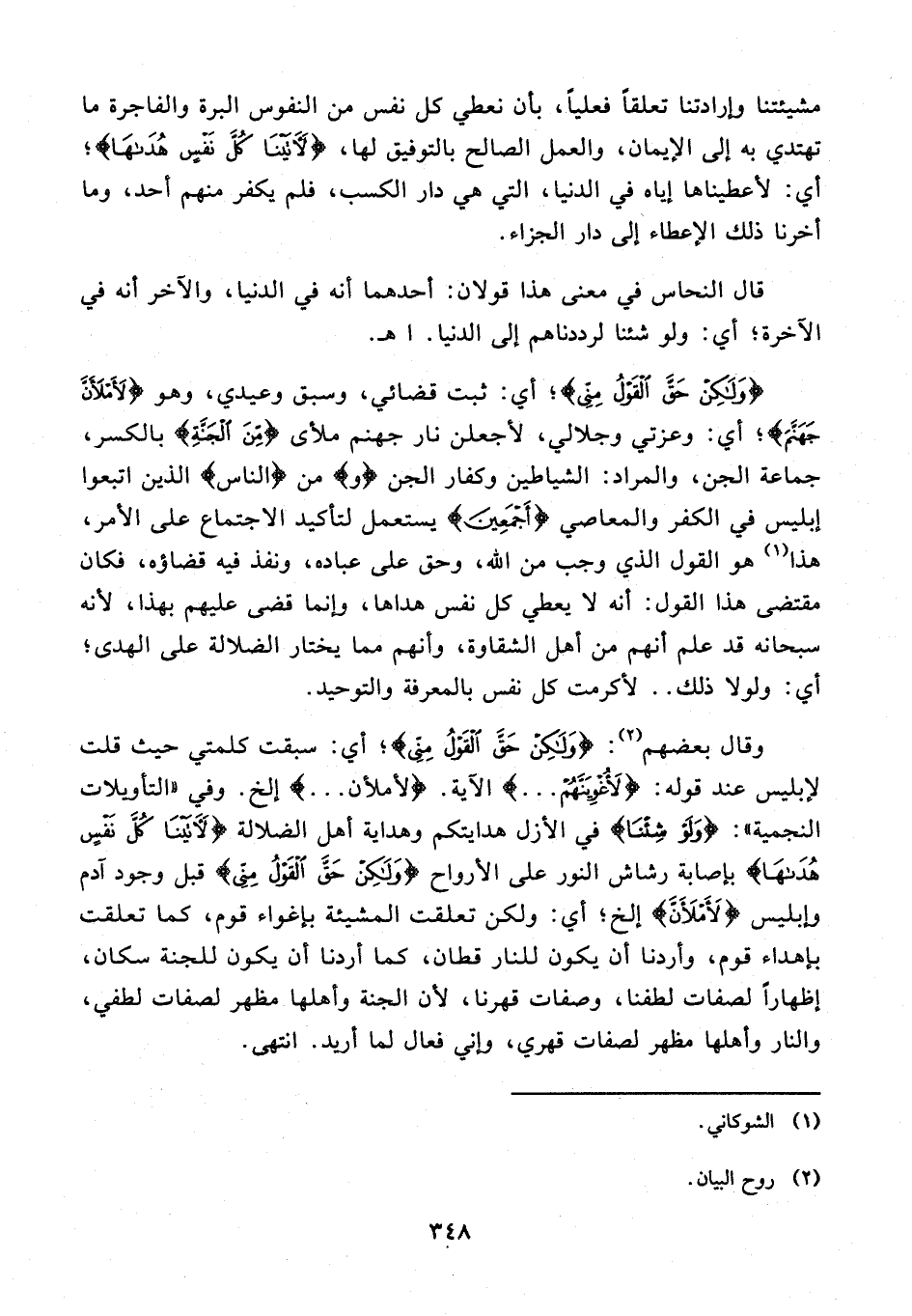 وقال بعضهم (¬2): {وَلَكِنْ حَقَّ الْقَوْلُ مِنِّي}؛ أي: سبقت كلمتي حيث قلت لإبليس عند قوله: {لَأُغْوِيَنَّهُمْ ...} الآية. {لَأَمْلَأَنَّ ...} إلخ. وفي "التأويلات النجمية": {وَلَوْ شِئْنَا} في الأزل هدايتكم وهداية أهل الضلالة {لَآتَيْنَا كُلَّ نَفْسٍ هُدَاهَا} بإصابة رشاش النور على الأرواح {وَلَكِنْ حَقَّ الْقَوْلُ مِنِّي} قبل وجود آدم وإبليس {لَأَمْلَأَنَّ} إلخ؛ أي: ولكن تعلقت المشيئة بإغواء قوم، كما تعلقت بإهداء قوم، وأردنا أن يكون للنار قطان، كما أردنا أن يكون للجنة سكان، إظهارًا لصفات لطفنا، وصفات قهرنا؛ لأن الجنة وأهلها مظهر لصفات لطفى، والنار وأهلها مظهر لصفات قهري، وإني فعال لما أريد. انتهى.