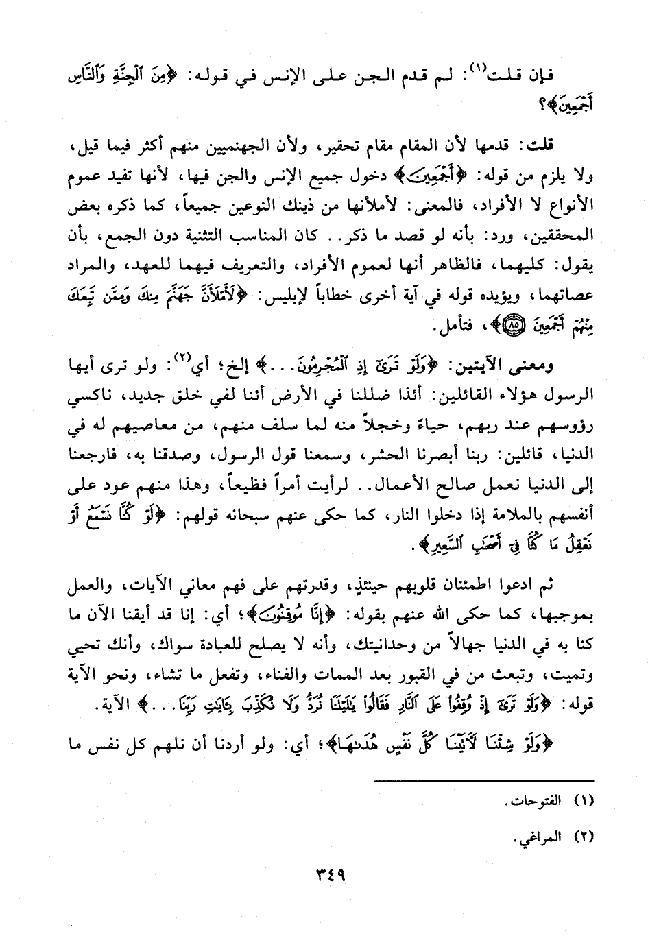قلت: قدمها لأن المقام مقام تحقير، ولأن الجهنميين منهم أكثر فيما قيل، ولا يلزم من قوله: {أَجْمَعِينَ} دخول جميع الإنس والجن فيها, لأنها تفيد عموم الأنواع لا الأفراد، فالمعنى: لأملأنها من ذينك النوعين جميعًا، كما ذكره بعض المحققين، ورد: بأنه لو قصد ما ذكر .. كان المناسب التثنية دون الجمع، بأن يقول: كليهما، فالظاهر أنها لعموم الأفراد، والتعريف فيهما للعهد، والمراد عصاتهما، ويؤيده قوله في آية أخرى خطابًا لإبليس: {لَأَمْلَأَنَّ جَهَنَّمَ مِنْكَ وَمِمَّنْ تَبِعَكَ مِنْهُمْ أَجْمَعِينَ (85)}، فتأمل.