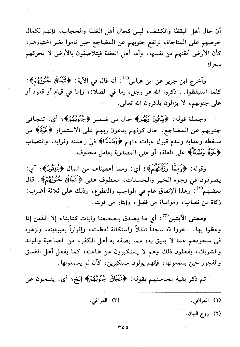 وأخرج ابن جرير عن ابن عباس (¬1): أنه قال في الآية: {تَتَجَافَى جُنُوبُهُمْ}: كلما استيقظوا .. ذكروا الله عز وجل، إما في الصلاة، وإما في قيام أو قعود أو على جنوبهم، لا يزالون يذكرون الله تعالى.