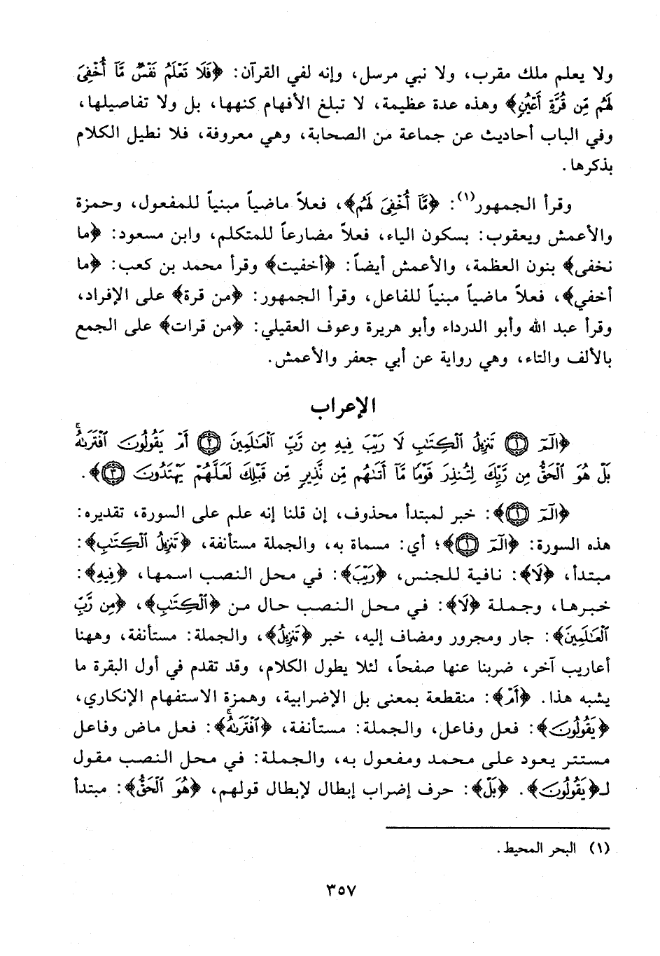 {الم (1)}: خبر لمبتدأ محذوف، إن قلنا إنه علم على السورة، تقديره: هذه السورة: {الم (1)}؛ أي: مسماة به، والجملة مستأنفة، {تَنْزِيلُ الْكِتَابِ}: مبتدأ، {لَا}: نافية للجنس، {رَيْبَ}: في محل النصب اسمها، {فِيهِ}: خبرها، وجملة {لَا}: في محل النصب حال من {الْكِتَابِ}، {مِنْ رَبِّ الْعَالَمِينَ}: جار ومجرور ومضاف إليه، خبر {تَنْزِيلُ}، والجملة: مستأنفة، وهاهنا أعاريب آخر، ضربنا عنها صفحًا، لئلا يطول الكلام، وقد تقدم في أول البقرة ما يشبه هذا. {أَمْ}: منقطعة بمعنى بل الإضرابية، وهمزة الاستفهام الإنكاري، {يَقُولُونَ}: فعل وفاعل، والجملة: مستأنفة، {افْتَرَاهُ}: فعل ماض وفاعل مستتر يعود على محمد ومفعول به، والجملة: في محل النصب مقول لـ {يَقُولُونَ}. {بَلْ}: حرف إضراب إبطال لإبطال قولهم، {هُوَ الْحَقُّ}: مبتدأ