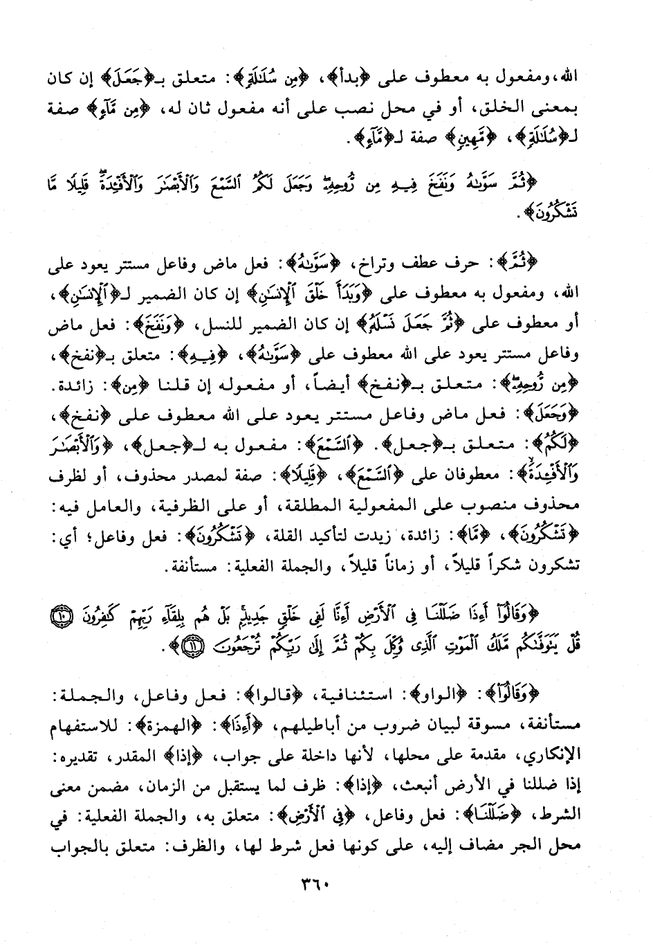 {ثُمَّ}: حرف عطف وتراخ، {سَوَّاهُ}: فعل ماض وفاعل مستتر يعود على الله، ومفعول به معطوف على {وَبَدَأَ خَلْقَ الْإِنْسَانِ} إن كان الضمير لـ {الْإِنْسَانِ}، أو معطوف على {ثُمَّ جَعَلَ نَسْلَهُ} إن كان الضمير للنسل، {وَنَفَخَ}: فعل ماض وفاعل مستتر يعود على الله معطوف على {سَوَّاهُ}، {فِيهِ}: متعلق بـ {نفخ}، {مِنْ رُوحِهِ}: متعلق بـ {نفخ} أيضًا، أو مفعوله إن قلنا {مِنْ}: زائدة. {وَجَعَلَ}: فعل ماض وفاعل مستتر يعود على الله معطوف على {نفخ}، {لَكُمُ}: متعلق بـ {جعل}. {السَّمْعَ}: مفعول به لـ {جعل}، {وَالْأَبْصَارَ وَالْأَفْئِدَةَ}: معطوفان على {السَّمْعَ}، {قَلِيلًا}: صفة لمصدر محذوف، أو لظرف محذوف منصوب على المفعولية المطلقة، أو على الظرفية، والعامل فيه: {تَشْكُرُونَ}، {مَا}: زائدة، زيدت لتأكيد القلة، {تَشْكُرُونَ}: فعل وفاعل؛ أي: تشكرون شكرًا قليلًا، أو زمانًا قليلًا، والجملة الفعلية: مستأنفة.