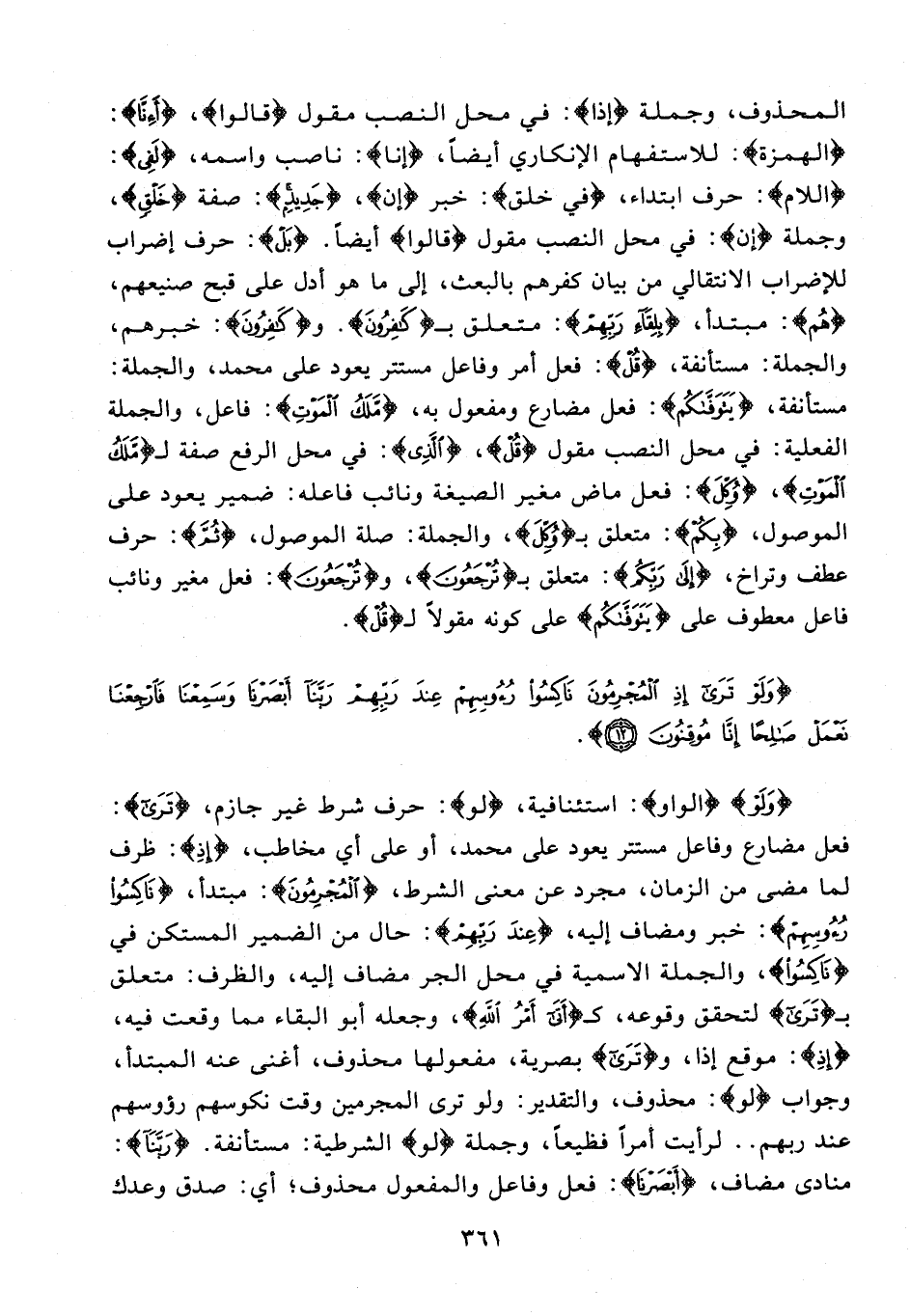 {وَلَوْ} {الواو}: استئنافية، {لو}: حرف شرط غير جازم، {تَرَى}: فعل مضارع وفاعل مستتر يعود على محمد، أو على أي مخاطب، {إِذِ}: ظرف لما مضى من الزمان، مجرد عن معنى الشرط، {الْمُجْرِمُونَ}: مبتدأ، {نَاكِسُو رُءُوسِهِمْ}: خبر ومضاف إليه، {عِنْدَ رَبِّهِمْ}: حال من الضمير المستكن في {نَاكِسُو}، والجملة الاسمية في محل الجر مضاف إليه، والظرف: متعلق بـ {تَرَى} لتحقق وقوعه، {أَتَى أَمْرُ اللَّهِ}، وجعله أبو البقاء مما وقعت فيه، {إِذِ}: موقع إذا، و {تَرَى} بصرية، مفعولها محذوف، أغنى عنه المبتدأ، وجواب {لو}: محذوف، والتقدير: ولو ترى المجرمين وقت نكوسهم رؤوسهم عند ربهم .. لرأيت أمرًا فظيعًا، وجملة {لو} الشرطية: مستأنفة. {رَبَّنَا}: منادى مضاف، {أَبْصَرْنَا}: فعل وفاعل والمفعول محذوف؛ أي: صدق وعدك