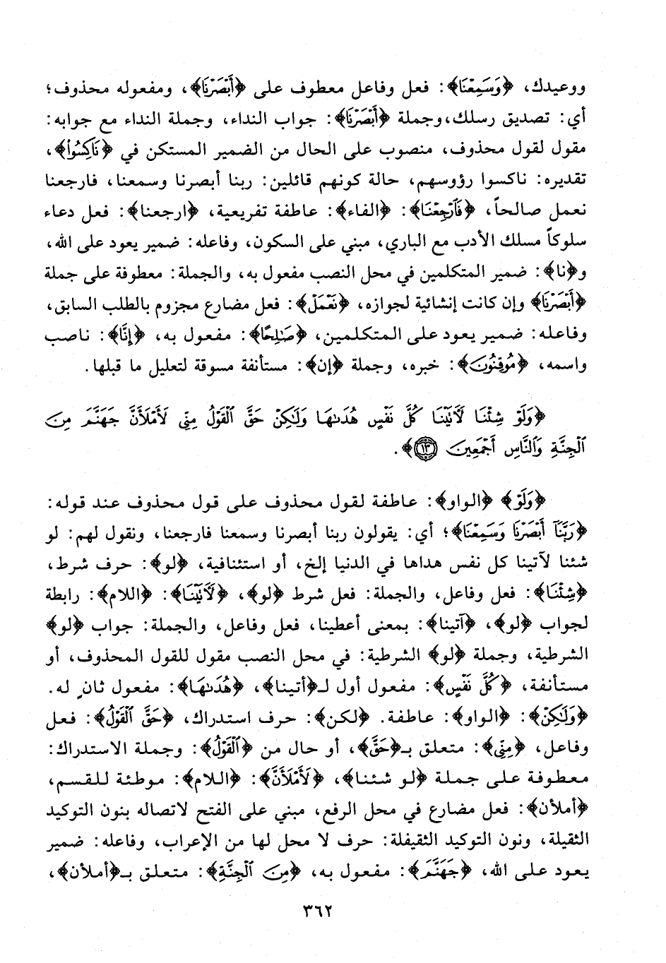 {وَلَوْ} {الواو}: عاطفة لقول محذوف على قول محذوف عند قوله: {رَبَّنَا أَبْصَرْنَا وَسَمِعْنَا}؛ أي: يقولون ربنا أبصرنا وسمعنا فارجعنا، ونقول لهم: لو شئنا لآتينا كل نفس هداها في الدنيا إلخ، أو استئنافية، {لو}: حرف شرط، {شِئْنَا}: فعل وفاعل، والجملة؛ فعل شرط {لو}، {لَآتَيْنَا}: {اللام}: رابطة لجواب {لو}، {آتينا}: بمعنى أعطينا، فعل وفاعل، والجملة: جواب {لو} الشرطية، وجملة {لو} الشرطية: في محل النصب مقول للقول المحذوف، أو مستأنفة، {كُلَّ نَفْسٍ}: مفعول أول لـ {أتينا}، {هُدَاهَا}: مفعول ثانٍ له. {وَلَكِنْ}: {الواو}: عاطفة. {لكن}: حرف استدراك، {حَقَّ الْقَوْلُ}: فعل وفاعل، {مِنِّي}: متعلق بـ {حَقَّ}، أو حال من {الْقَوْلُ}: وجملة الاستدراك: معطوفة على جملة {وَلَوْ شِئْنَا}، {لَأَمْلَأَنَّ}: {اللام}: موطئة للقسم، {أملأن}: فعل مضارع في محل الرفع، مبني على الفتح لاتصاله بنون التوكيد الثقيلة، ونون التوكيد الثقيلة: حرف لا محل لها من الإعراب، وفاعله: ضمير يعود على الله، {جَهَنَّمَ}: مفعول به، {مِنَ الْجِنَّةِ}: متعلق بـ {أملأن}،