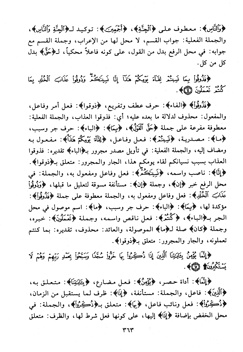 {فَذُوقُوا} {الفاء}: حرف عطف وتفريع، {ذوقوا}: فعل أمر وفاعل، والمفعول: محذوف لدلالة ما بعده عليه؛ أي: فذوقوا العذاب، والجملة الفعلية: معطوفة مفرعة على جملة {حَقَّ الْقَوْلُ}، {بِمَا}: {الباء}: حرف جر وسبب، {ما}: مصدرية، {نَسِيتُمْ}: فعل وفاعل، {لِقَاءَ يَوْمِكُمْ هَذَا}: مفعول به ومضاف إليه، والجملة الفعلية: في تأويل مصدر مجرور بـ {الباء} تقديره: فذوقوا العذاب بسبب نسيانكم لقاء يومكم هذا، الجار والمجرور: متعلق بـ {ذوقوا}. {إِنَّا}: ناصب واسمه، {نَسِينَاكُمْ}: فعل وفاعل ومفعول به، والجملة: في محل الرفع خبر {إن}، وجملة {إن}: مستأنفة مسوقة لتعليل ما قبلها، {وَذُوقُوا عَذَابَ الْخُلْدِ}: فعل وفاعل ومفعول به، والجملة معطوفة على جملة {فَذُوقُوا}: مؤكدة لها، {بِمَا}: {الباء}: حرف جر وسبب، {ما}: اسم موصول في محل الجربـ {الباء}، {كُنْتُمْ}: فعل ناقص واسمه، وجملة {تَعْمَلُونَ}: خبره، وجملة {كان} صلة لـ {ما} الموصولة، والعائد: محذوف، تقديره: بما كنتم تعملونه، والجار والمجرور: متعلق بـ {ذوقوا}.
