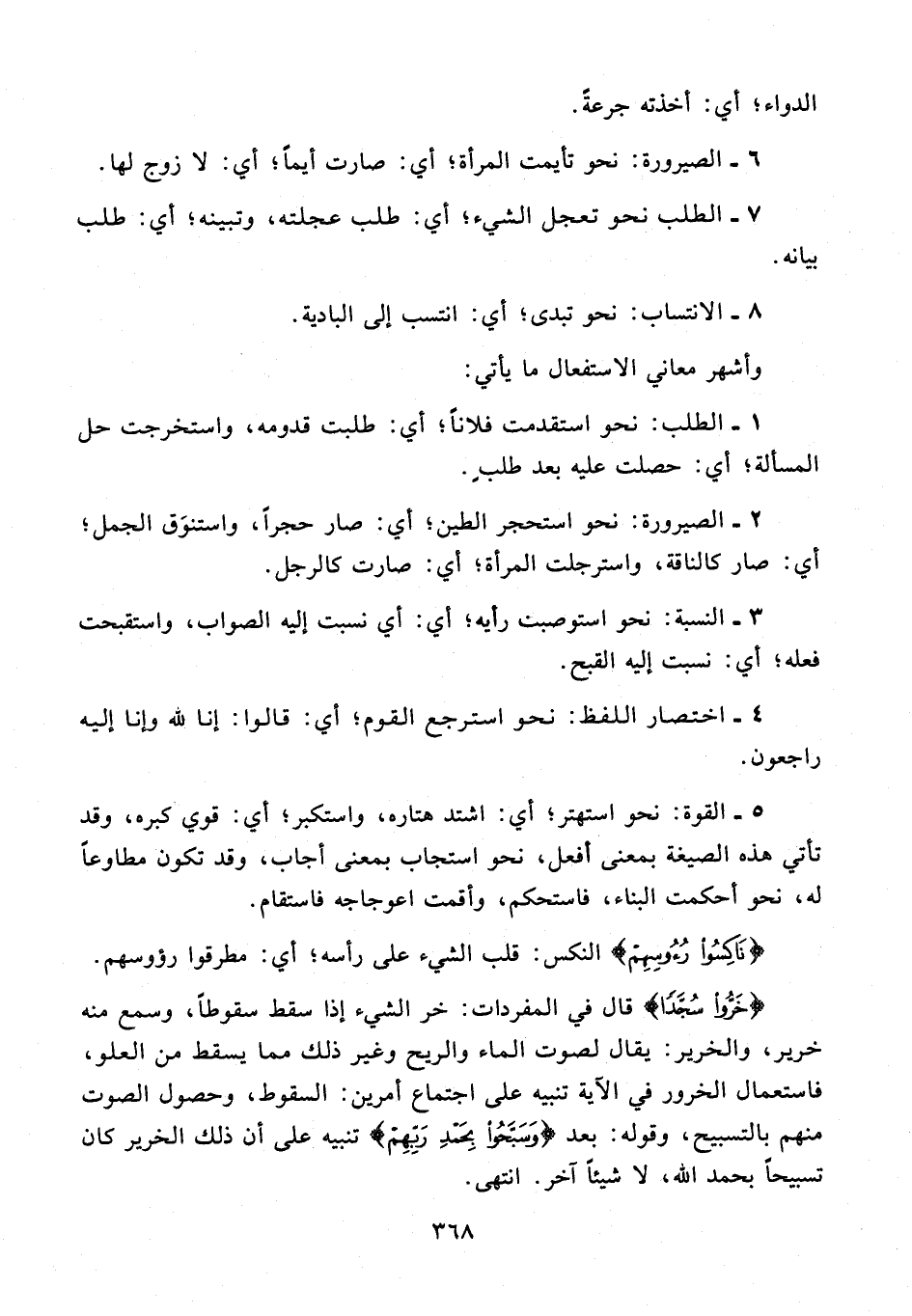 2 - الصيرورة: نحو استحجر الطين؛ أي: صار حجرًا، واستنوَق الجمل؛ أي: صار كالناقة، واسترجلت المرأة؛ أي: صارت كالرجل.