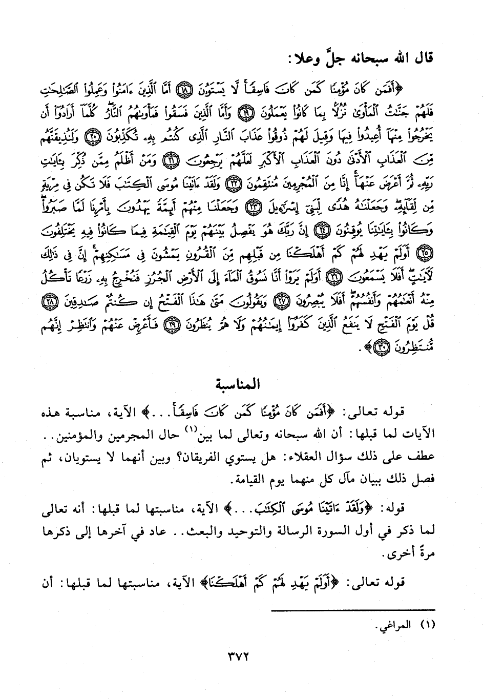 قوله تعالى: {أَفَمَنْ كَانَ مُؤْمِنًا كَمَنْ كَانَ فَاسِقًا ...} الآية، مناسبة هذه الآيات لما قبلها: أن الله سبحانه وتعالى لما بين (¬1) حال المجرمين والمؤمنين .. عطف على ذلك سؤال العقلاء: هل يستوي الفريقان؛ وبين أنهما لا يستويان، ثم فصل ذلك ببيان مآل كل منهما يوم القيامة.
