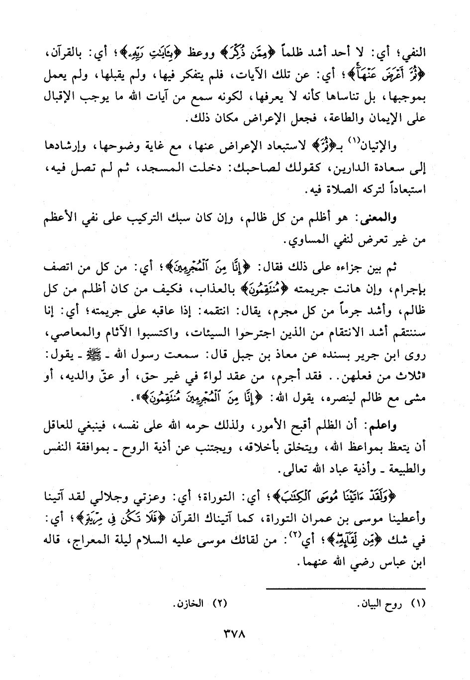 النفي؛ أي: لا أحد أشد ظلمًا {مِمَّنْ ذُكِّرَ} ووعظ {بِآيَاتِ رَبِّهِ}؛ أي: بالقرآن، {ثُمَّ أَعْرَضَ عَنْهَا}؛ أي: عن تلك الآيات، فلم يتفكر فيها, ولم يقبلها, ولم يعمل بموجبها، بل تناساها كأنه لا يعرفها, لكونه سمع من آيات الله ما يوجب الإقبال على الإيمان والطاعة، فجعل الإعراض مكان ذلك.