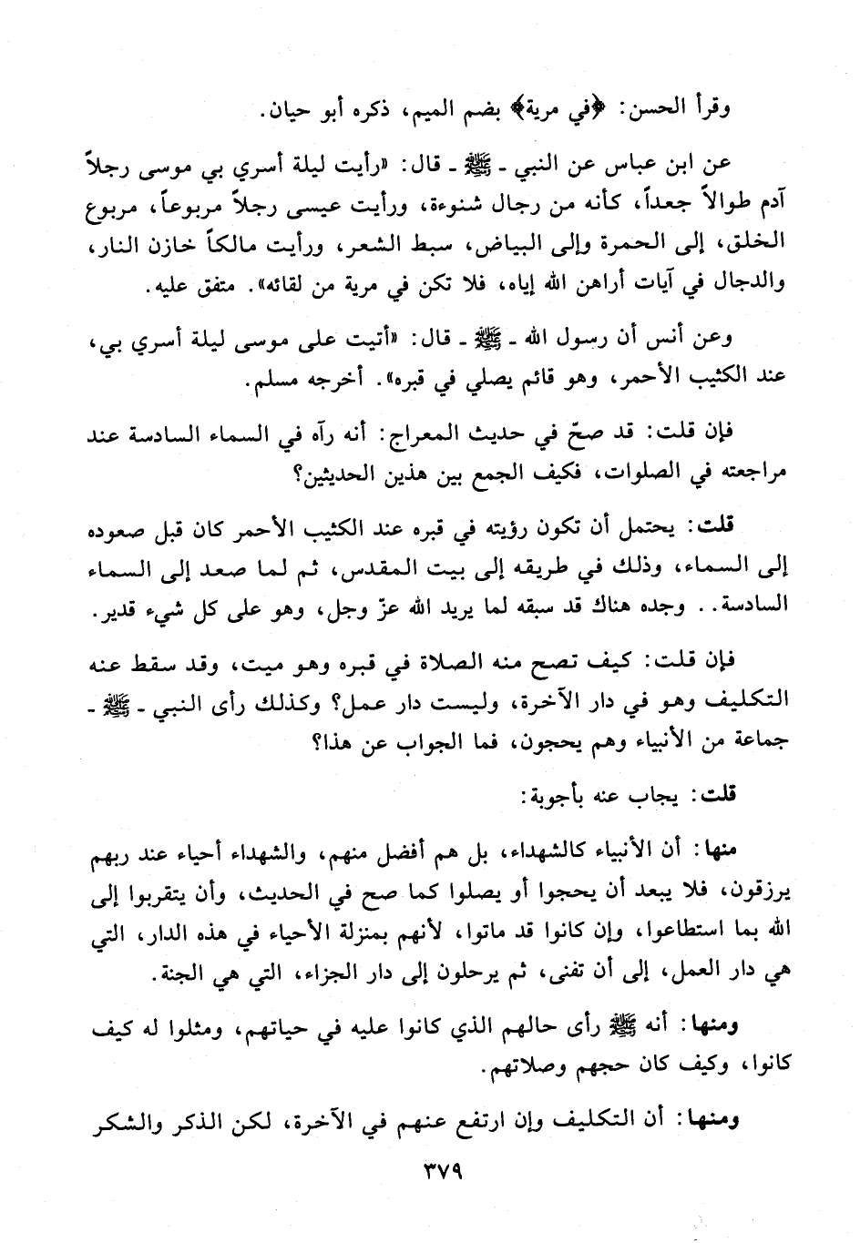 وعن أنس أن رسول الله - صلى الله عليه وسلم - قال: "أتيت على موسى ليلة أسري بي، عند الكثيب الأحمر، وهو قائم يصلي في قبره". أخرجه مسلم.