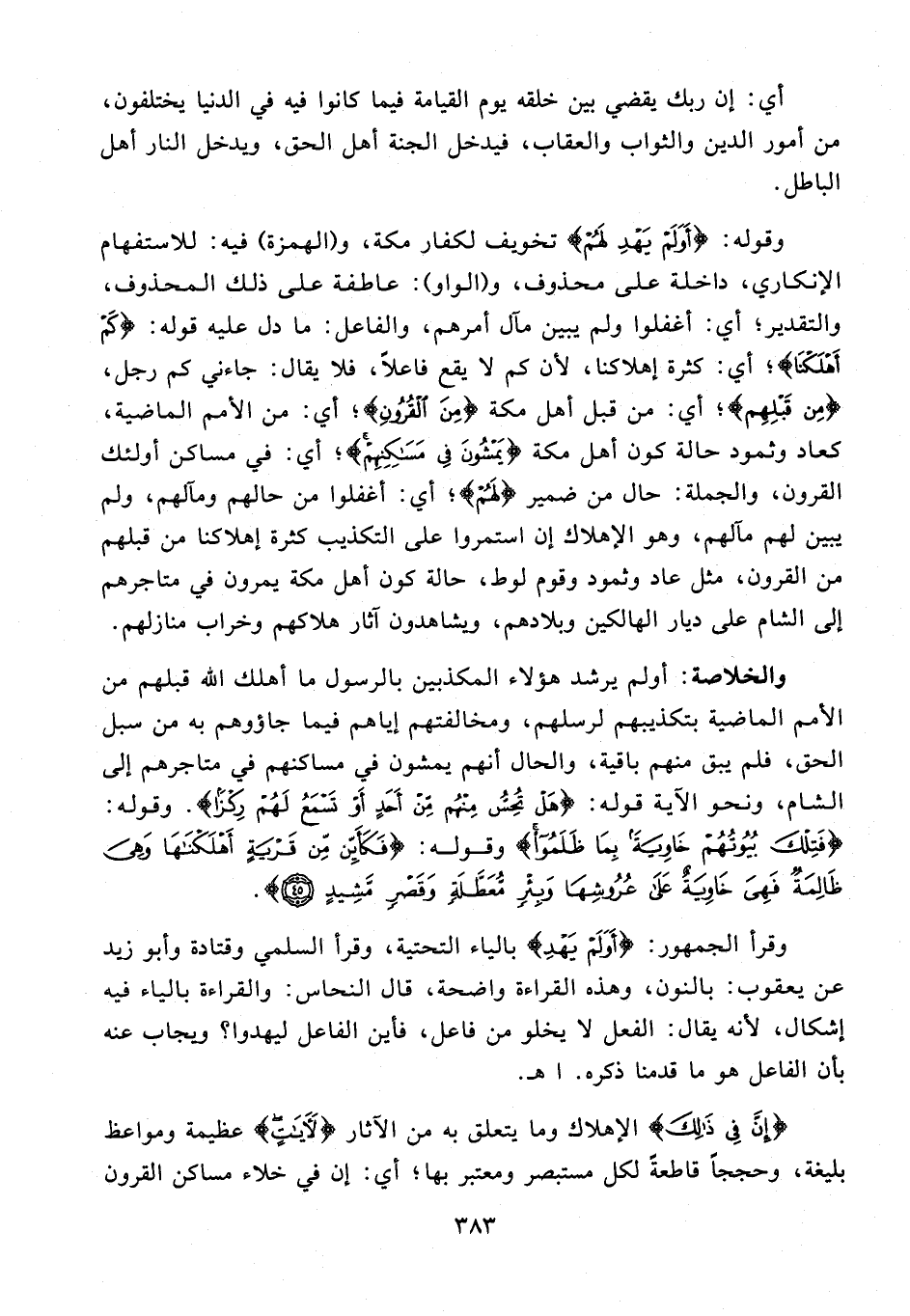 26 - وقوله: {أَوَلَمْ يَهْدِ لَهُمْ} تخويف لكفار مكة، و (الهمزة) فيه: للاستفهام الإنكاري، داخلة على محذوف، و (الواو): عاطفة على ذلك المحذوف، والتقدير؛ أي: أغفلوا ولم يبين مآل أمرهم، والفاعل: ما دل عليه قوله: {كَمْ أَهْلَكْنَا}؛ أي: كثرة إهلاكنا؛ لأن كم لا يقع فاعلًا، فلا يقال: جاءني كم رجل، {مِنْ قَبْلِهِمْ}؛ أي: من قبل أهل مكة {مِنَ الْقُرُونِ}؛ أي: من الأمم الماضية، كعاد وثمود حالة كون أهل مكة {يَمْشُونَ فِي مَسَاكِنِهِمْ}؛ أي: في مساكن أولئك القرون، والجملة: حال من ضمير {لَهُمْ}؛ أي: أغفلوا من حالهم ومآلهم، ولم يبين لهم مآلهم، وهو الإهلاك إن استمروا على التكذيب كثرة إهلاكنا من قبلهم من القرون، مثل عاد وثمود وقوم لوط، حالة كون أهل مكة يمرون في متاجرهم إلى الشام على ديار الهالكين وبلادهم، ويشاهدون آثار هلاكهم وخراب منازلهم.