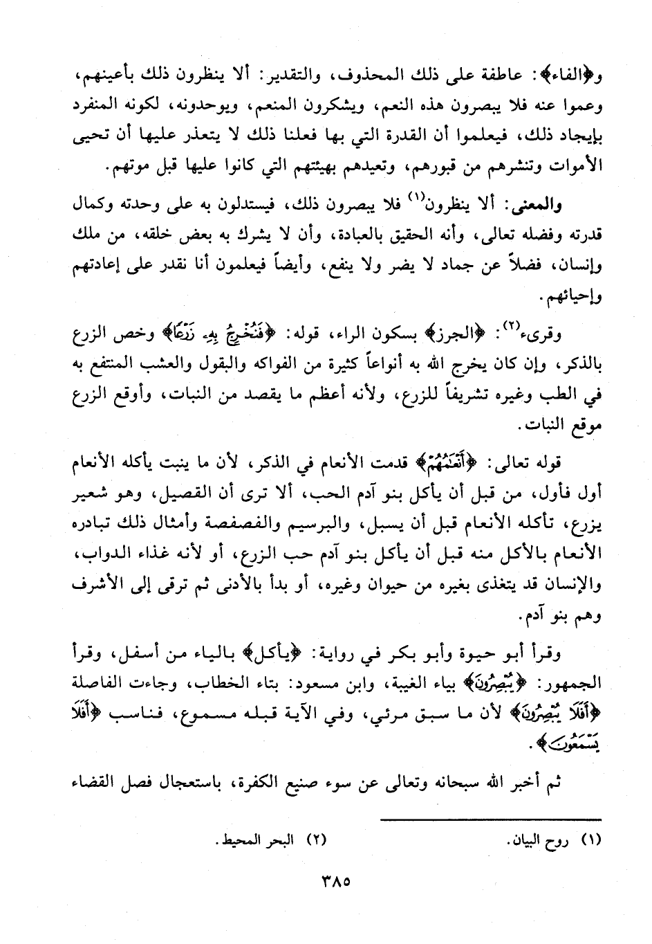 وقرأ أبو حيوة وأبو بكر في رواية: {يأكل} بالياء من أسفل، وقرأ الجمهور: {يُبْصِرُونَ} بياء الغيبة، وابن مسعود: بتاء الخطاب، وجاءت الفاصلة {أَفَلَا يُبْصِرُونَ} لأن ما سبق مرئي، وفي الآية قبله مسموع، فناسب {أَفَلَا يَسْمَعُونَ}.