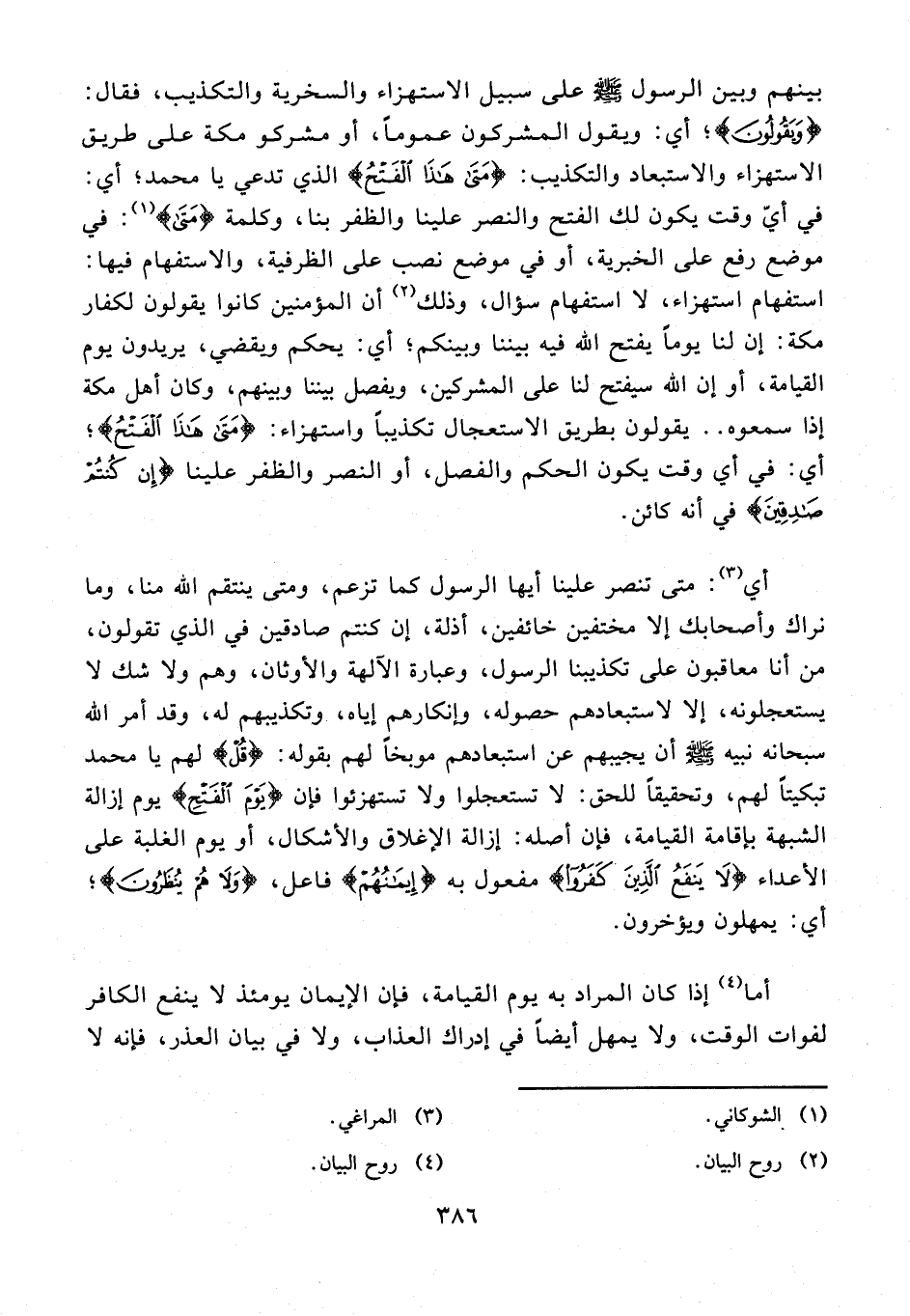 29 - وقد أمر الله سبحانه نبيه - صلى الله عليه وسلم - أن يجيبهم عن استبعادهم موبخًا لهم بقوله: {قُلْ} لهم يا محمد تبكيتًا لهم، وتحقيقًا للحق: لا تستعجلوا ولا تستهزئوا فإن {يَوْمَ الْفَتْحِ} يوم إزالة الشبهة بإقامة القيامة، فإن أصله: إزالة الإغلاق والأشكال، أو يوم الغلبة على الأعداء {لَا يَنْفَعُ الَّذِينَ كَفَرُوا} مفعول به {إِيمَانُهُمْ} فاعل، {وَلَا هُمْ يُنْظَرُونَ}؛ أي: يمهلون ويؤخرون.