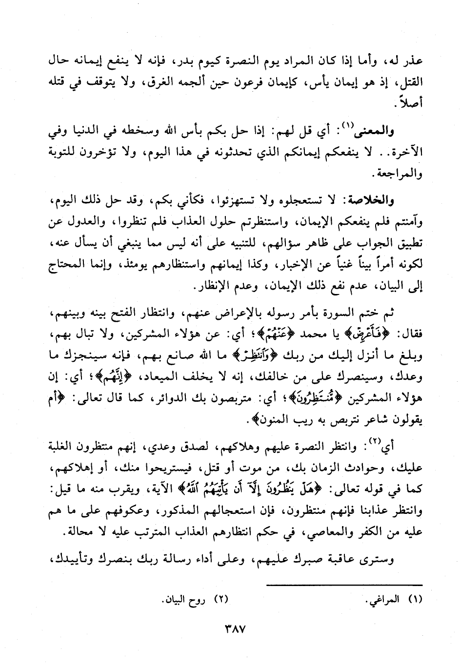 30 - ثم ختم السورة بأمر رسوله بالإعراض عنهم، وانتظار الفتح بينه وبينهم، فقال: {فَأَعْرِضْ} يا محمد {عَنْهُمْ}؛ أي: عن هؤلاء المشركين، ولا تبال بهم، وبلغ ما أنزل إليك من ربك {وَانْتَظِرْ} ما الله صانع بهم، فإنه سينجزك ما وعدك، وسينصرك على من خالفك، إنه لا يخلف الميعاد، {إِنَّهُمْ}؛ أي: إن هؤلاء المشركين {مُنْتَظِرُونَ}؛ أي: متربصون بك الدوائر، كما قال تعالى: {أم يقولون شاعر نتربص به ريب المنون}.