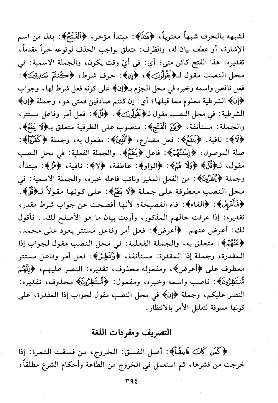 لشبهه بالحرف شبهًا معنويًا، {هَذَا}: مبتدأ مؤخر، {الْفَتْحُ}: بدل من اسم الإشارة، أو عطف بيان له، والظرف: متعلق بواجب الحذف لوقوعه خبرًا مقدمًا، تقديره: هذا الفتح كائن متى؛ أي: في أيّ وقت يكون، والجملة الاسمية: في محل النصب مقول لـ {يَقُولُونَ}، {إن}: حرف شرط، {كُنْتُمْ صَادِقِينَ}: فعل ناقص واسمه وخبره في محل الجزم بـ {إن} على كونه فعل شرط لها، وجواب {إن} الشرطية معلوم مما قبلها؛ أي: إن كنتم صادقين فمتى هو، وجملة {إن} الشرطية: في محل النصب مقول لـ {يَقُولُونَ}. {قُلْ}: فعل أمر وفاعل مستتر، والجملة: مستأنفة، {يَوْمَ الْفَتْحِ}: منصوب على الظرفية متعلق بـ {لَا يَنْفَعُ}، {لَا}: نافية. {يَنْفَعُ}: فعل مضارع، {الَّذِينَ}: مفعول به، وجملة {كَفَرُوا}: صلة الموصول، {إِيمَانُهُمْ}: فاعل {يَنْفَعُ}. والجملة الفعلية: في محل النصب مقول، لـ {قُلْ} {وَلَا هُمْ}: {الواو}: عاطفة، {لا}: نافية، {هُمْ}: مبتدأ، وجملة {يُنْظَرُونَ}: من الفعل المغير ونائب فاعله خبره، والجملة الاسمية: في محل النصب معطوفة على جملة {لَا يَنْفَعُ}: على كونها مقولًا لـ {قُلْ}. {فَأَعْرِضْ}: {الفاء}: فاء الفصيحة؛ لأنها أفصحت عن جواب شرط مقدر، تقديره: إذا عرفت حالهم المذكور، وأردت بيان ما هو الأصلح لك .. فأقول لك: أعرض عنهم. {أعرض}: فعل أمر وفاعل مستتر يعود على محمد، {عَنْهُمْ}: متعلق به، والجملة الفعلية: في محل النصب مقول لجواب إذا المقدرة، وجملة إذا المقدرة: مستأنفة، {وَانْتَظِرْ}: فعل أمر وفاعل مستتر معطوف على {أعرض}، ومفعوله محذوف، تقديره: النصر عليهم، {إِنَّهُمْ مُنْتَظِرُونَ}: ناصب واسمه وخبره، ومفعول: {مُنْتَظِرُونَ} محذوف، تقديره: النصر عليكم، وجملة {إن} في محل النصب مقول لجواب إذا المقدرة، على كونها مسوقة لتعليل الأمر بالانتظار.